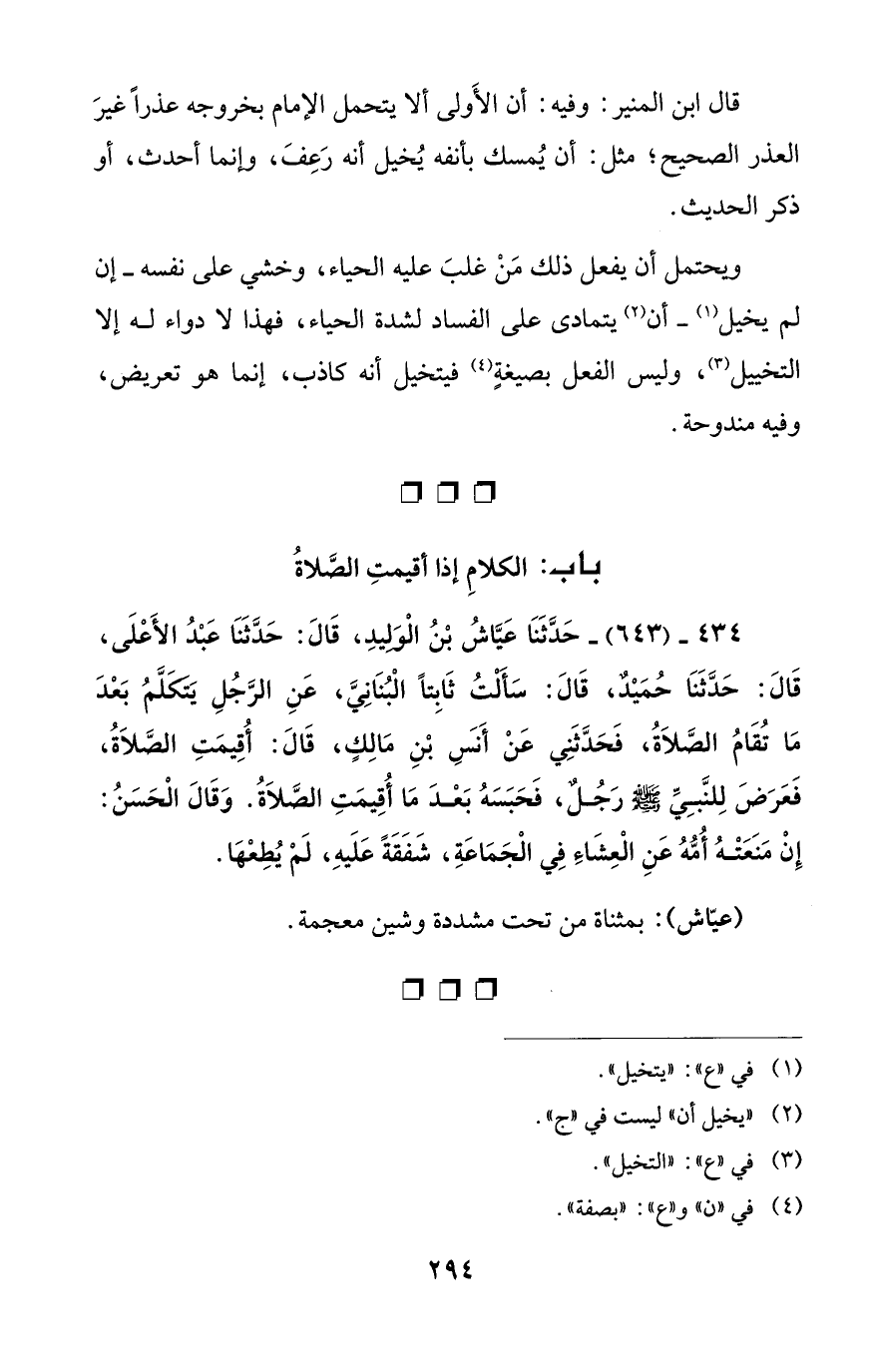 434 - (643) - حَدَّثَنَا عَيَّاشُ بْنُ الْوَلِيدِ، قَالَ: حَدَّثَنَا عَبدُ الأَعْلَى، قَالَ: حَدَّثَنَا حُمَيْدٌ، قَالَ: سَأَلْتُ ثَابِتًا الْبُنَانِيَّ، عَنِ الرَّجُلِ يَتكَلَّمُ بَعْدَ مَا تُقَامُ الصَّلَاةُ، فَحَدَّثَنِي عَنْ أَنس بْنِ مَالِكٍ، قَالَ: أُقِيمَتِ الصَّلَاةُ، فَعَرَضَ لِلنَّبِيِّ - صلى الله عليه وسلم - رَجُلٌ، فَحَبَسَهُ بَعْدَ مَا أُقِيمَتِ الصَّلَاةُ. وَقَالَ الْحَسَنُ: إِنْ مَنَعَتْهُ أُمُّهُ عَنِ الْعِشَاءَ في الْجَمَاعَةِ، شَفَقَةً عَلَيهِ، لَمْ يُطِعْهَا.
