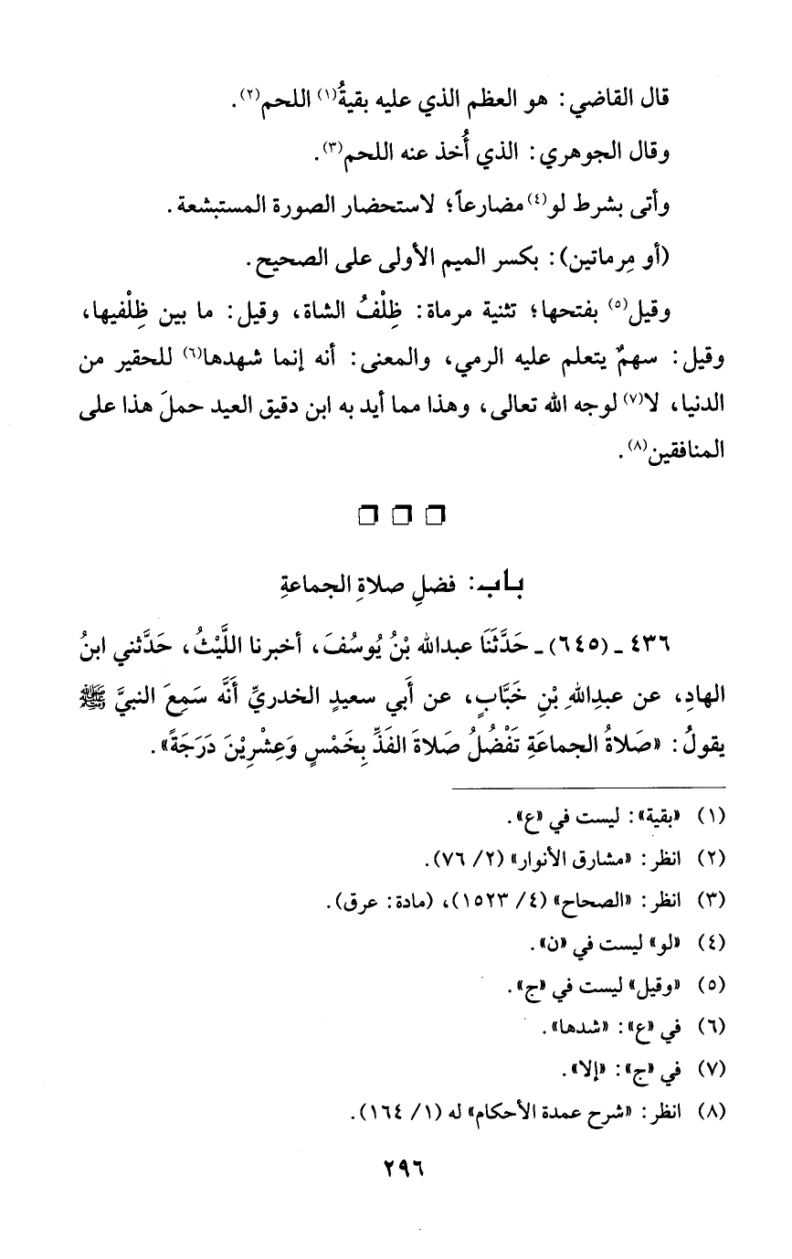 436 - (645) - حَدَّثَنَا عبد الله بْنُ يُوسُفَ، أخبرنا اللَّيْثُ، حَدَّثني ابنُ الهادِ، عن عبدِ اللهِ بْنِ خَبَّابٍ، عن أَبي سعيدٍ الخدريِّ أَنَّه سَمِعَ النبيَّ - صلى الله عليه وسلم - يقولُ: "صَلاةُ الجماعَةِ تَفْضُلُ صَلاةَ الفَذِّ بِخَمْسٍ وَعِشْرِيْنَ دَرَجَةً".