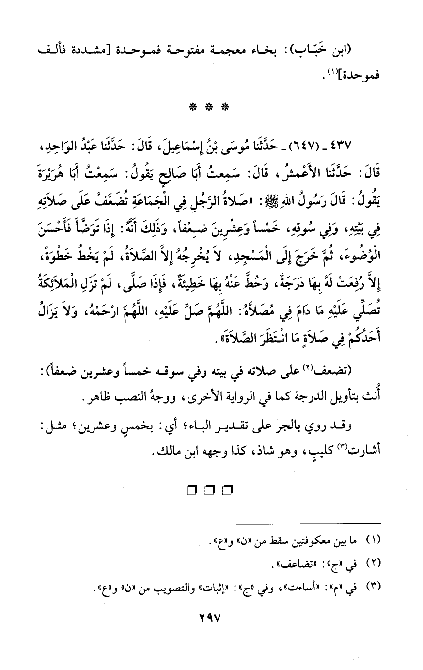 437 - (647) - حَدَّثَنا مُوسَى بْنُ إِسْمَاعِيلَ، قَالَ: حَدَّثَنا عَبْدُ الوَاحِدِ، قَالَ: حَدَّثَنا الأَعْمشُ، قَالَ: سَمِعتُ أَبَا صَالحٍ يَقُولُ: سَمِعْتُ أَبَا هُرَيْرَةَ يَقُولُ: قَالَ رَسُولُ اللهِ - صلى الله عليه وسلم -: "صَلاةُ الرَّجُلِ في الْجَمَاعَةِ تُضَعَّفُ عَلَى صَلَاتِهِ في بَيْتهِ، وَفِي سُوقهِ، خَمْسًا وَعِشْرِينَ ضِعْفًا، وَذَلِكَ أنَّهُ: إِذَا تَوَضَّأَ فَأَحْسَنَ الْوُضُوءَ، ثُمَّ خَرَجَ إِلَى الْمَسْجِدِ، لا يُخْرِجُهُ إلا الصَّلَاةُ، لَمْ يَخْطُ خَطْوَةً، إلا رُفِعَتْ لَهُ بِهَا دَرَجَةٌ، وَحُطَّ عَنْهُ بِهَا خَطِيئةٌ، فَإِذَا صَلَّى، لَمْ تَزَلِ الْمَلَائِكَةُ تُصَلِّي عَلَيْهِ مَا دَامَ في مُصَلَّاهُ: اللهُمَّ صَلِّ عَلَيْهِ، اللهُمَّ ارْحَمْهُ، وَلَا يَزَالُ أَحَدُكُمْ في صَلَاةٍ مَا انْتَظَرَ الصَّلَاةَ".