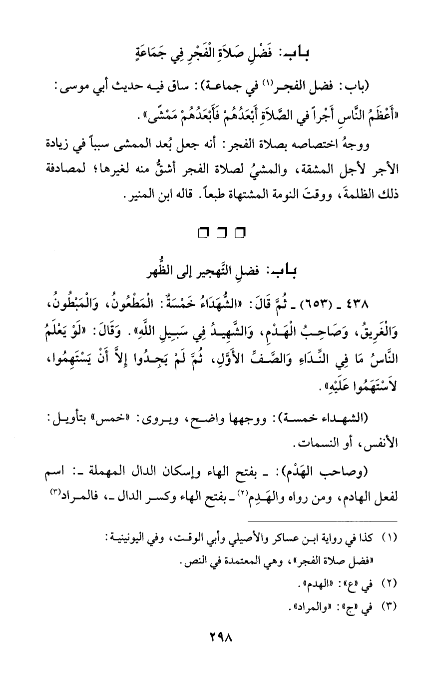 438 - (653) - ثُمَّ قَالَ: "الشُّهَدَاءُ خَمْسَة: الْمَطْعُونُ، وَالْمَبْطُونُ، وَالْغَرِيقُ، وَصَاحِبُ الْهَدْمِ، وَالشَّهِيدُ في سَبِيلِ اللهِ". وَقَالَ: "لَوْ يَعْلَمُ النَّاسُ مَا في النِّدَاءِ وَالصَّفِّ الأَوَّلِ، ثُمَّ لَمْ يجِدُوا إلا أَنْ يَسْتَهِمُوا، لاسْتَهَمُوا عَلَيْهِ".