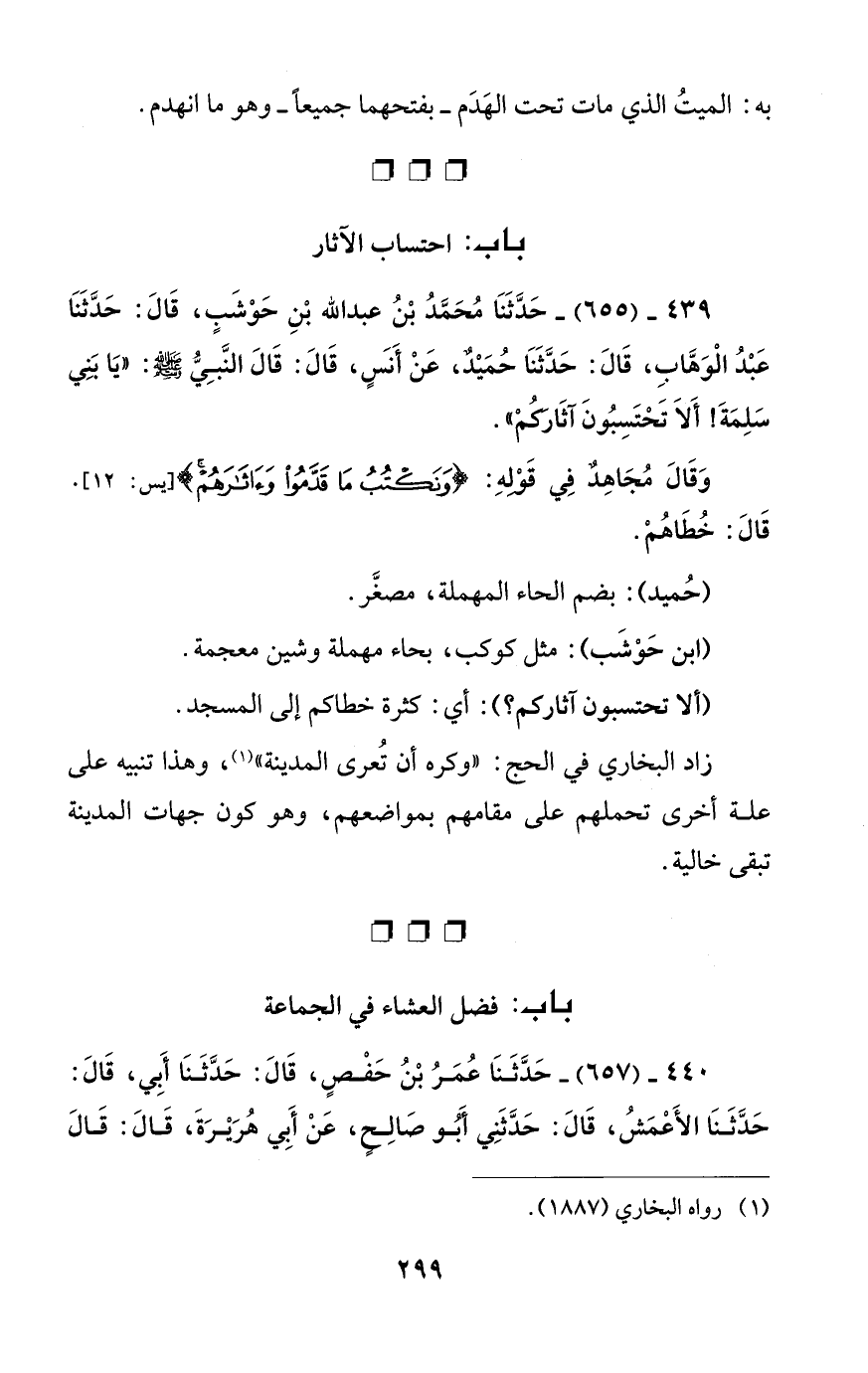 439 - (655) - حَدَّثَنَا محمدُ بْنُ عبد الله بْنِ حَوْشَبٍ، قَالَ: حَدَّثَنَا عَبْدُ الْوَهَّابِ، قَالَ: حَدَّثَنَا حُمَيْدٌ، عَنْ أَنسٍ، قَالَ: قَالَ النَّبِيُّ - صلى الله عليه وسلم -: "يَا بَنِي سَلِمَةَ! أَلَا تَحْتَسِبُونَ آثَارَكمْ".