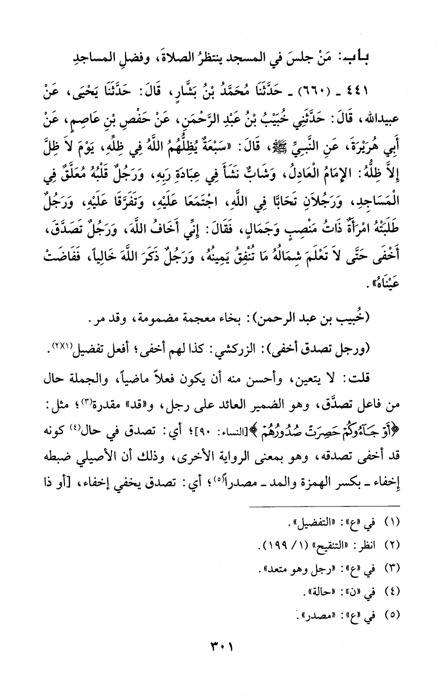 441 - (660) - حَدَّثَنَا مُحَمَّدُ بْنُ بَشَّارٍ، قَالَ: حَدَّثَنَا يَحْيَى، عَنْ عبيد الله، قَالَ: حَدَّثَنِي خُبَيْبُ بْنُ عَبْدِ الرَّحْمَنِ، عَنْ حَفْصِ بْنِ عَاصمٍ، عَنْ أَبِي هُرَيْرَةَ، عَنِ النَّبِيِّ - صلى الله عليه وسلم -، قَالَ: "سَبْعَةٌ يُظِلُّهُمُ الله في ظِلِّهِ، يَوْمَ لا ظِلَّ إلا ظِلُّهُ: الإمَامُ الْعَادِلُ، وَشَابٌّ نشَأَ في عِبَادَةِ رَبِهِ، وَرَجُلٌ قَلْبُهُ مُعَلَّقٌ في الْمَسَاجِدِ، وَرَجُلَانِ تَحَابَّا في اللهِ، اجْتَمَعَا عَلَيْهِ، وَتَفَرَّقَا عَلَيْهِ، وَرَجُلٌ طَلَبَتْهُ امْرَأةٌ ذَاتُ مَنْصِبٍ وَجَمَالٍ، فَقَالَ: إِنِّي أَخَافُ اللهَ، وَرَجُل تَصَدَّقَ، أَخْفَى حَتَّى لا تَعْلَمَ شِمَالُهُ مَا تُنْفِقُ يَمِينُهُ، وَرَجُلٌ ذَكَرَ اللهَ خَالِيًا، فَفَاضَتْ عَيْنَاهُ".