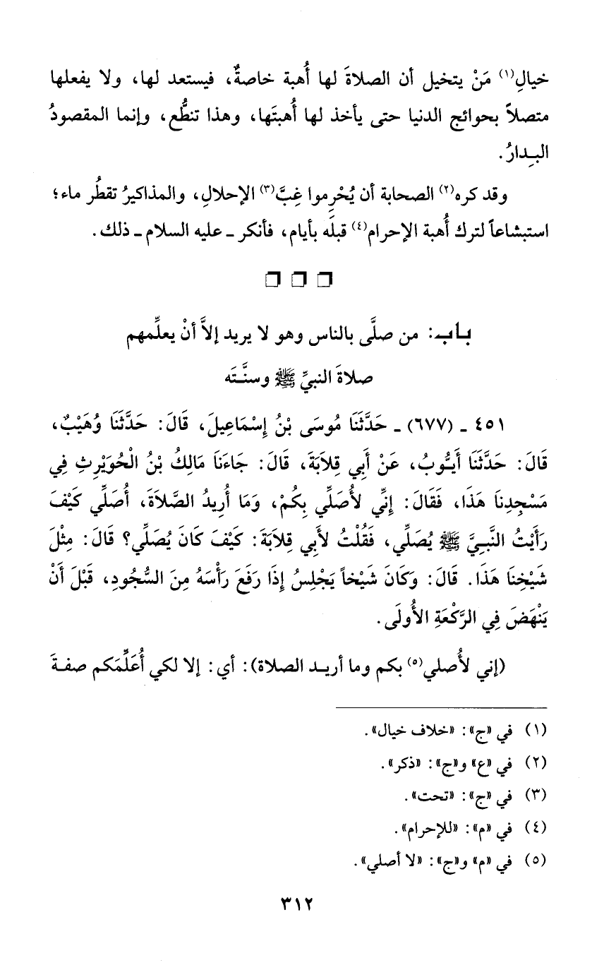 451 - (677) - حَدَّثَنَا مُوسَى بْنُ إِسْمَاعِيلَ، قَالَ: حَدَّثَنَا وُهَيْبٌ، قَالَ: حَدَّثَنَا أَيُّوبُ، عَنْ أبي قِلاَبَةَ، قَالَ: جَاءَناَ مَالِكُ بْنُ الْحُويرِثِ فِي مَسْجدِناَ هَذَا، فَقَالَ: إِنِّي لأُصَلِّي بِكُمْ، وَمَا أُرِيدُ الصَّلاَةَ، أُصَلِّي كيْفَ رَأَيْتُ النَّبِيَّ - صلى الله عليه وسلم - يُصَلِّي، فَقُلْتُ لأَبي قِلاَبَةَ: كَيْفَ كَانَ يُصَلِّي؟ قَالَ: مِثْلَ شَيْخِنَا هَذَا. قَالَ: وَكَانَ شَيْخًا يَجْلِسُ إِذَا رَفَعَ رَأْسَهُ مِنَ السُّجُودِ، قَبْلَ أَنْ يَنْهَضَ فِي الرَّكعَةِ الأُولَى.