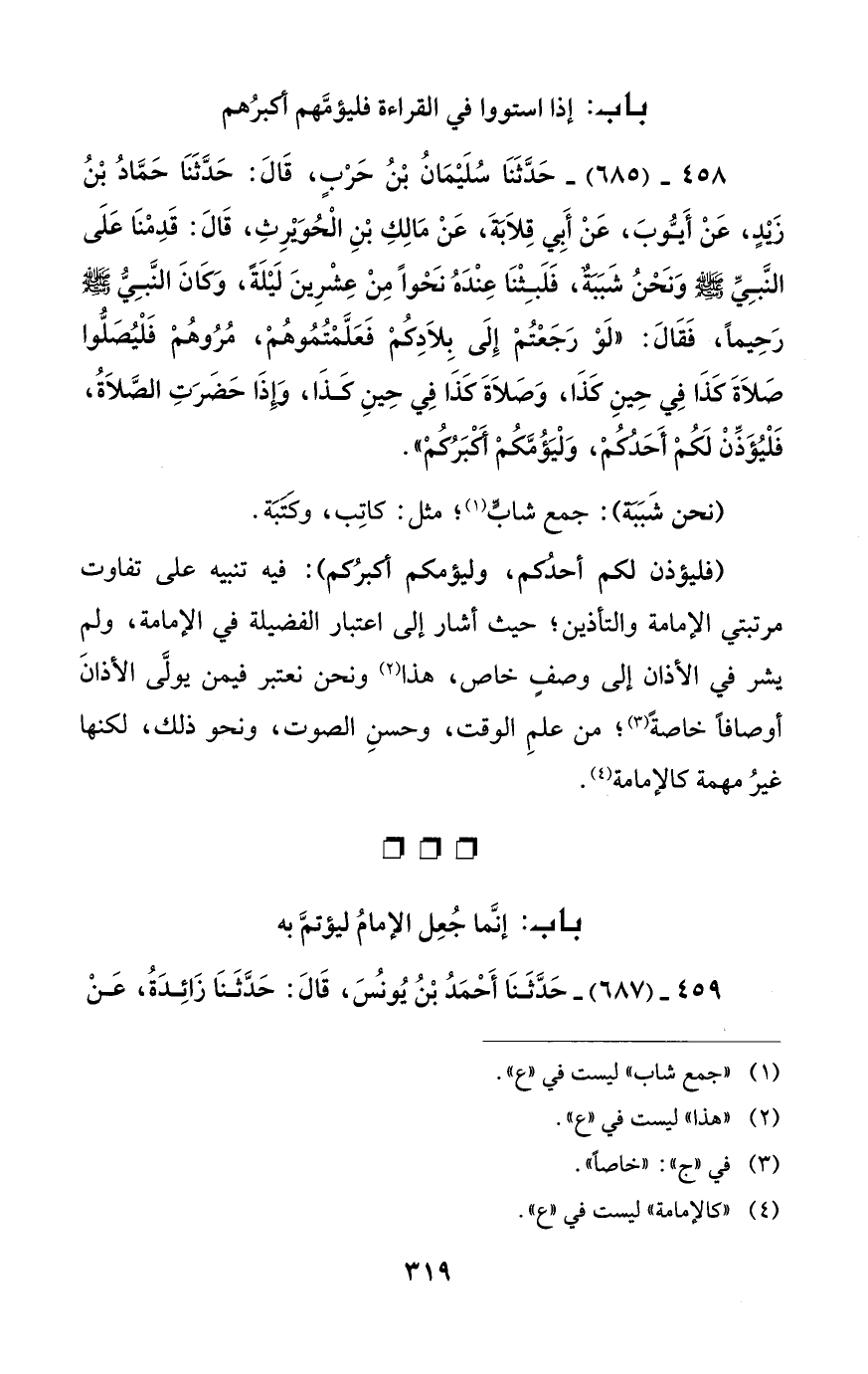 458 - (685) - حَدَّثَنَا سُلَيْمَانُ بْنُ حَرْبٍ، قَالَ: حَدَّثَنَا حَمَّادُ بْنُ زيدٍ، عَنْ أَيُّوبَ، عَنْ أَبِي قِلاَبةَ، عَنْ مَالِكِ بْنِ الْحُويرِثِ، قَالَ: قَدِمْنَا عَلَى النَّبِيِّ - صَلَّى الله عليه وسلم - وَنَحْنُ شَبَبةٌ، فَلَبِثْنَا عِنْدَهُ نَحْوًا مِنْ عِشْرِينَ لَيْلَةً، وَكَانَ النَّبِيُّ - صَلَّى الله عليه وسلم - رَحِيمًا، فَقَالَ: "لَوْ رَجَعْتُمْ إِلَى بِلاَدِكُمْ فَعَلَّمْتُمُوهُمْ، مُرُوهُمْ فَلْيُصَلّوا صَلاَةَ كَذَا فِي حِينِ كَذَا، وَصَلاَةَ كَذَا فِي حِينِ كَذَا، وَإِذَا حَضَرَتِ الصَّلاَةُ، فَلْيُؤَذِّنْ لَكُمْ أَحَدكمْ، وَلْيَؤُمَّكُمْ أكبَرُكُمْ".