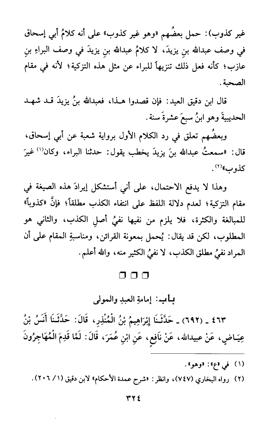 وبعضُهم تعلق في رد الكلام الأول برواية شعبة عن أبي إسحاق، قال: "سمعتُ عبد الله بنَ يزيدَ يخطب يقول: حدَّثنا البراء، وكان (¬1) غيرَ كذوب" (¬2).
