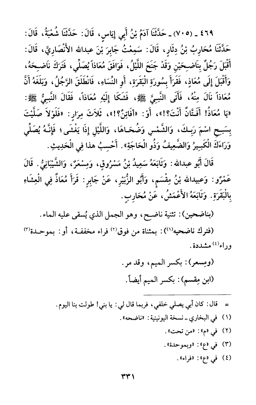 469 - (705) - حَدَّثَنَا آدَمُ بْنُ أَبِي إِيَاسٍ، قَالَ: حَدَّثَنَا شُعْبَةُ، قَالَ: حَدَّثَنَا مُحَارِبُ بْنُ دِثَارٍ، قَالَ: سَمِعْتُ جَابِرَ بْنَ عبد الله الأَنْصَارِيَّ، قَالَ: أَقْبَلَ رَجُلٌ بِنَاضِحَيْنِ وَقَدْ جَنَحَ اللَّيْلُ، فَوَافَقَ مُعَاذًا يُصَلِّي، فترَكَ ناَضِحَهُ، وَأَقْبَلَ إِلَى مُعَاذٍ، فَقَرَأَ بِسُورَةِ الْبَقَرَةِ، أَوِ النِّسَاءَ، فَانْطَلَقَ الرَّجُلُ، وَبَلَغَهُ أَنَّ مُعَاذًا ناَلَ مِنْهُ، فَأَتَى النَّبِيَّ - صَلَّى الله عليه وسلم -، فَشَكَا إِلَيْهِ مُعَاذًا، فَقَالَ النَّبِيُّ - صَلَّى الله عليه وسلم -: "يَا مُعَاذُ! أَفَتَّانٌ أَنْتَ؟! "، أَوْ: "أفَاتِنٌ؟! "، ثَلاَثَ مِرَارٍ: "فَلَوْلاَ صَلَّيْتَ بِسَبح اسْمَ رَبِكَ، وَالشَّمْسِ وَضُحَاهَا، وَاللَّيْلِ إِذَا يَغْشَى؛ فَإِنَّهُ يُصَلِّي وَرَاءَكَ الْكَبِيرُ وَالضَّعِيفُ وَذُو الْحَاجَةِ". أَحْسِبُ هذا فِي الْحَدِيثِ.