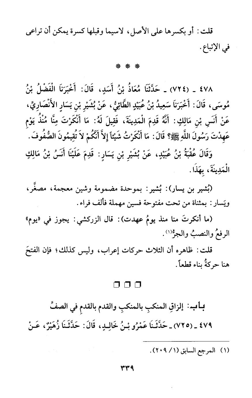 478 - (724) - حَدَّثَنَا مُعَاذُ بْنُ أَسَدٍ، قَالَ: أَخْبَرَنَا الْفَضْلُ بْنُ مُوسَى، قَالَ: أَخْبَرَنَا سَعِيدُ بْنُ عُبَيْدٍ الطَّائِيُّ، عَنْ بُشيْرِ بْنِ يَسَارٍ الأَنْصَارِيِّ، عَنْ أَنس بْنِ مَالِكٍ: أَنَّهُ قَدِمَ الْمَدِينَةَ، فَقِيلَ لَهُ: مَا أَنْكَرْتَ مِنَّا مُنْذُ يَوْمِ عَهِدْتَ رَسُولَ اللهِ - صلى الله عليه وسلم -؟ قَالَ: مَا أَنْكَرْتُ شَيْئًا إلَّا أَنَّكمْ لاَ تُقِيمُونَ الصُّفُوفَ.