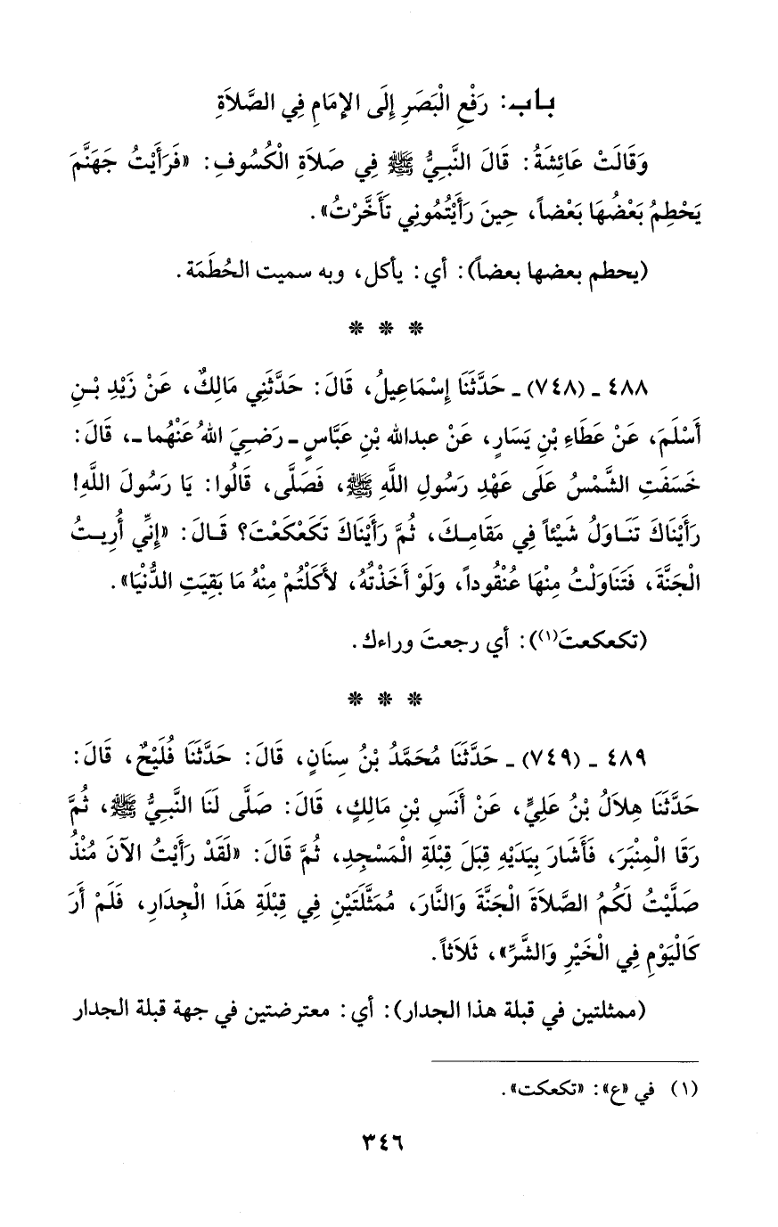 488 - (748) - حَدَّثَنَا إِسْمَاعِيلُ، قَالَ: حَدَّثَنِي مَالِكٌ، عَنْ زيدِ بْنِ أَسْلَمَ، عَنْ عَطَاءِ بْنِ يَسَارٍ، عَنْ عبد الله بْنِ عَبَّاسٍ -رَضِيَ اللهُ عَنْهُما-، قَالَ: خَسَفَتِ الشَّمْسُ عَلَى عَهْدِ رَسُولِ اللهِ - صلى الله عليه وسلم -، فَصَلَّى، قَالُوا: يَا رَسُولَ اللهِ! رَأَيْنَاكَ تَنَاوَلُ شَيْئًا فِي مَقَامِكَ، ثُمَّ رَأَيْنَاكَ تَكَعْكَعْتَ؟ قَالَ: "إِنِّي أُرِيتُ الْجَنَّةَ، فَتَنَاوَلْتُ مِنْهَا عُنْقُودًا، وَلَوْ أَخَذْتهُ، لأكلْتُمْ مِنْهُ مَا بَقِيَتِ الدُّنْيَا".