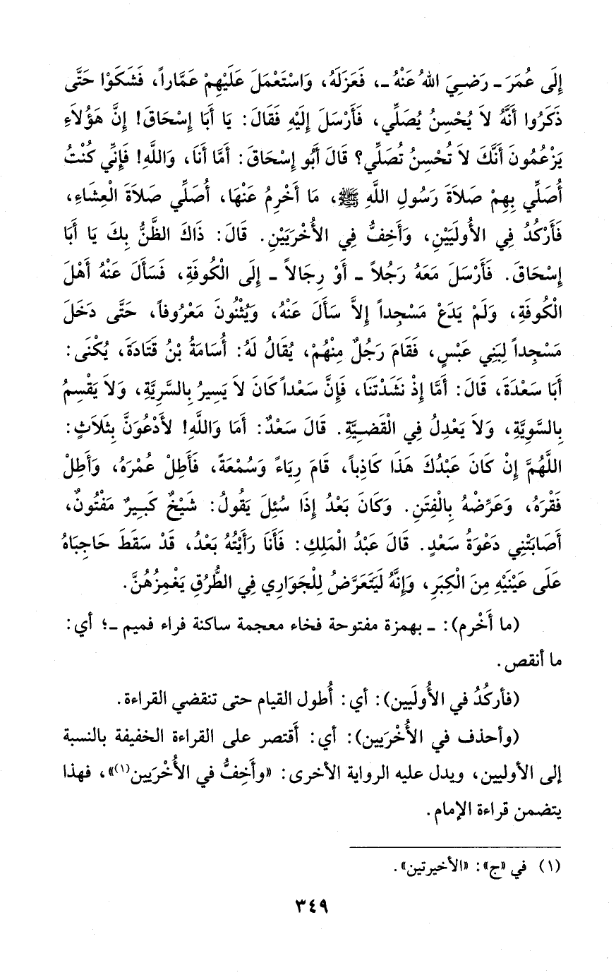 إِلَى عُمَرَ -رَضِيَ اللهُ عَنْهُ-، فَعَزَلَهُ، وَاسْتَعْمَلَ عَلَيْهِمْ عَمَّارًا، فَشَكَوْا حَتَّى ذَكَرُوا أَنَّهُ لاَ يُحْسِنُ يُصَلِّي، فَأَرْسَلَ إِلَيْهِ فَقَالَ: يَا أَبَا إِسْحَاقَ! إِنَّ هَؤُلاَءِ يَزْعُمُونَ أَنَّكَ لاَ تُحْسِنُ تُصَلِّي؟ قَالَ أَبُو إِسْحَاقَ: أَمَّا أَناَ، وَاللهِ! فَإِنِّي كُنْتُ أُصَلِّي بِهِمْ صَلاَةَ رَسُولِ اللهِ - صَلَّى الله عليه وسلم -، مَا أَخْرِمُ عَنْهَا، أُصَلِّي صَلاَةَ الْعِشَاءِ، فَأَرْكُدُ فِي الأُولَيَيْنِ، وَأَخِفُّ فِي الأُخْرَيَيْنِ. قَالَ: ذَاكَ الظَّنُّ بِكَ يَا أَبَا إِسْحَاقَ. فَأَرْسَلَ مَعَهُ رَجُلًا -أَوْ رِجَالًا- إِلَى الْكُوفَةِ، فَسَأَلَ عَنْهُ أَهْلَ الْكُوفَةِ، وَلَمْ يَدَع مَسْجدًا إِلَّا سَألَ عَنْهُ، وَيُثْنُونَ مَعْرُوفًا، حَتَّى دَخَلَ مَسْجِدًا لِبَنِي عَبْسٍ، فَقَامَ رَجُلٌ مِنْهُمْ، يُقَالُ لَهُ: أُسَامَةُ بْنُ قَتَادَةَ، يُكْنَى: أَبَا سَعْدَةَ، قَالَ: أَمَّا إِذْ نشَدْتَنَا، فَإِنَّ سَعْدًا كَانَ لاَ يَسِيرُ بِالسَّرِيَّةِ، وَلاَ يَقْسِمُ بِالسَّوِيَّةِ، وَلاَ يَعْدِلُ فِي الْقَضِيَّةِ. قَالَ سَعْدٌ: أَمَا وَاللهِ! لأَدْعُوَنَّ بِثَلاَثٍ: اللَّهُمَّ إِنْ كَانَ عَبْدُكَ هَذَا كَاذِبًا، قَامَ رِيَاءً وَسُمْعَةً، فَأَطِلْ عُمْرَهُ، وَأَطِلْ فَقْرَهُ، وَعَرِّضْهُ بِالْفِتَنِ. وَكَانَ بَعْدُ إِذَا سُئِلَ يَقُولُ: شَيْخٌ كَبِيرٌ مَفْتُونٌ، أَصَابتني دَعْوَةُ سَعْدٍ. قَالَ عَبْدُ الْمَلِكِ: فَأَناَ رَأَيْتُهُ بَعْدُ، قَدْ سَقَطَ حَاجِبَاهُ عَلَى عَيْنَيْهِ مِنَ الْكِبَرِ، وَإِنَّهُ لَيتَعَرَّضُ لِلْجَوَارِي فِي الطُّرُقِ يَغْمِزُهُنَّ.