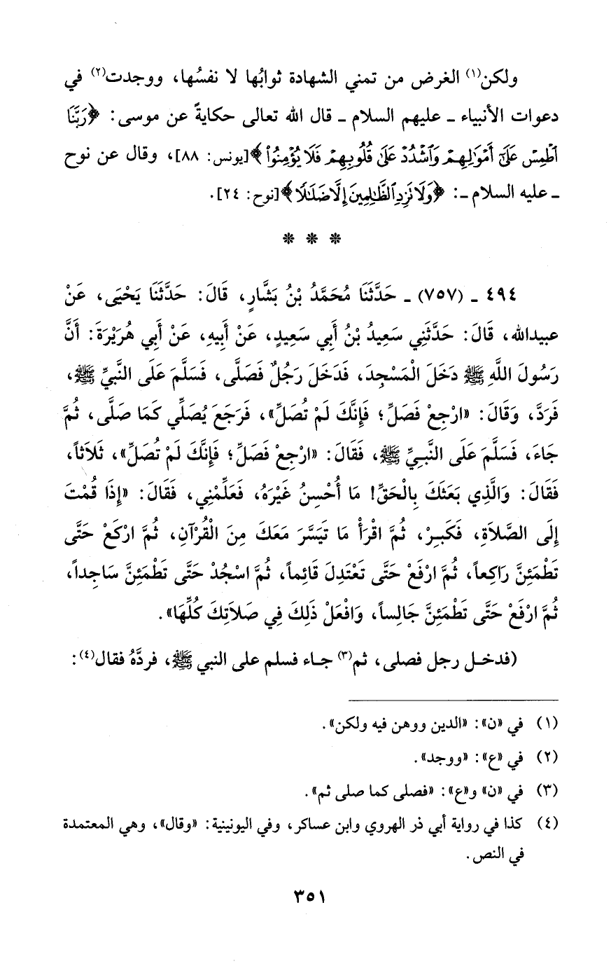 494 - (757) - حَدَّثَنَا مُحَمَّدُ بْنُ بَشَّارٍ، قَالَ: حَدَّثَنَا يَحْيَى، عَنْ عبيد الله، قَالَ: حَدَّثَنِي سَعِيدُ بْنُ أَبِي سَعِيدٍ، عَنْ أَبِيهِ، عَنْ أَبِي هُرَيْرَةَ: أَنَّ رَسُولَ اللهِ - صلى الله عليه وسلم - دَخَلَ الْمَسْجدَ، فَدَخَلَ رَجُلٌ فَصَلَّى، فَسَلَّمَ عَلَى النَّبيِّ - صلى الله عليه وسلم -، فَرَدَّ، وَقَالَ: "ارْجِعْ فَصَلِّ؛ فَإِنَّكَ لَمْ تُصَلِّ"، فَرَجَعَ يُصَلِّي كَمَا صَلَّى، ثُمَّ جَاءَ، فَسَلَّمَ عَلَى النَّبِيِّ - صلى الله عليه وسلم -، فَقَالَ: "ارْجِعْ فَصَلِّ؟؛ فَإِنَّكَ لَمْ تُصَلِّ"، ثَلاَثًا، فَقَالَ: وَالَّذِي بَعَثَكَ بِالْحَقِّ! مَا أُحْسِنُ غَيْرَهُ، فَعَلِّمْنِي، فَقَالَ: "إِذَا قُمْتَ إِلَى الصَّلاَةِ، فَكَبِرْ، ثُمَّ اقْرَأْ مَا تَيَسَّرَ مَعَكَ مِنَ الْقُرْآنِ، ثُمَّ ارْكعْ حَتَّى تَطْمَئِنَّ رَاكعًا، ثُمَّ ارْفَعْ حَتَّى تَعْتَدِلَ قَائِمًا، ثُمَّ اسْجُدْ حَتَّى تَطْمَئِنَّ سَاجِدًا، ثُمَّ ارْفَعْ حَتَّى تَطْمَئِنَّ جَالِسًا، وَافْعَلْ ذَلِكَ فِي صَلاَتِكَ كُلِّهَا".