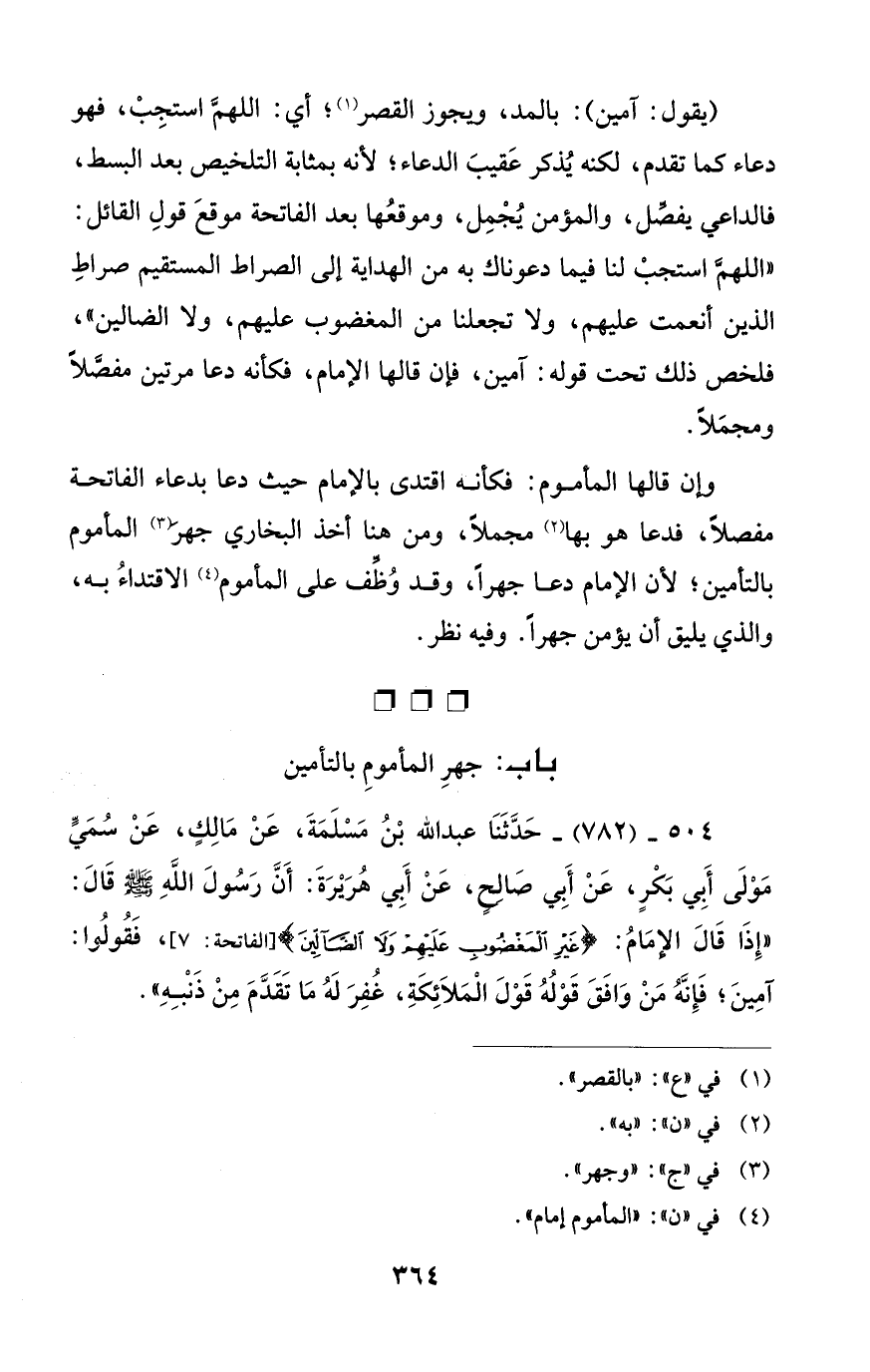 504 - (782) - حَدَّثَنَا عبد الله بْنُ مَسْلَمَةَ، عَنْ مَالِكٍ، عَنْ سُمَيٍّ مَوْلَى أَبِي بَكْرٍ، عَنْ أَبِي صَالِحٍ، عَنْ أَبِي هُرَيْرَةَ: أَنَّ رَسُولَ الله - صلى الله عليه وسلم - قَالَ: "إِذَا قَالَ الإمَامُ: {غَيْرِ الْمَغْضُوبِ عَلَيْهِمْ وَلَا الضَّالِّينَ} [الفاتحة: 7]، فَقُولُوا: آمِينَ؛ فَإِنَّهُ مَنْ وَافَقَ قَوْلُهُ قَوْلَ الْمَلاَئِكَةِ، غُفِرَ لَهُ مَا تَقَدَّمَ مِنْ ذَنْبِهِ".