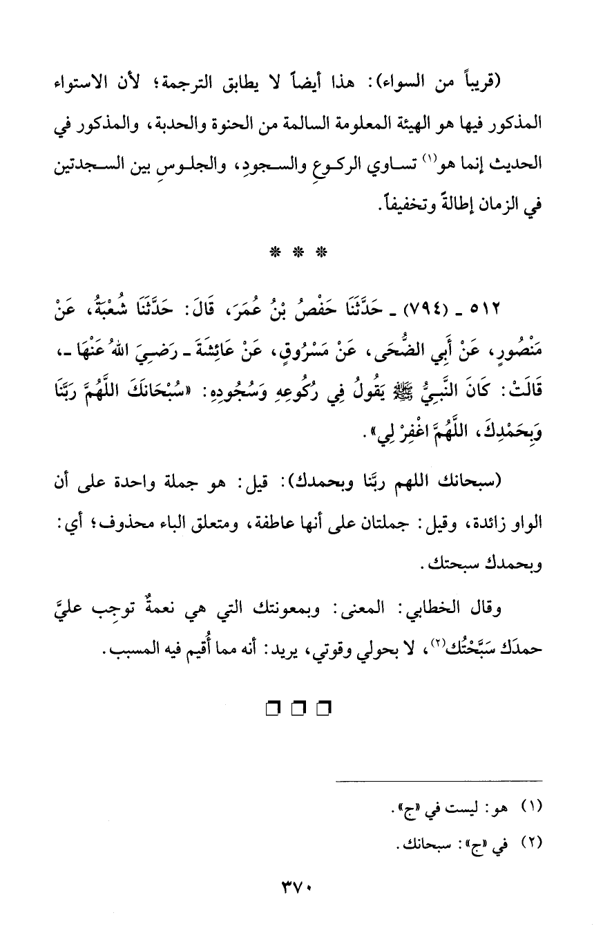 512 - (794) - حَدَّثَنَا حَفْصُ بْنُ عُمَرَ، قَالَ: حَدَّثَنَا شُعْبَةُ، عَنْ مَنْصُورٍ، عَنْ أَبِي الضُّحَى، عَنْ مَسْرُوقٍ، عَنْ عَائِشَةَ -رَضِيَ اللهُ عَنْهَا-، قَالَتْ: كَانَ النَّبِيُّ - صلى الله عليه وسلم - يَقُولُ فِي رُكُوعِهِ وَسُجُودِهِ: "سُبْحَانَكَ اللَّهُمَّ رَبَّنَا وَبِحَمْدِكَ، اللَّهُمَّ اغْفِرْ لِي".