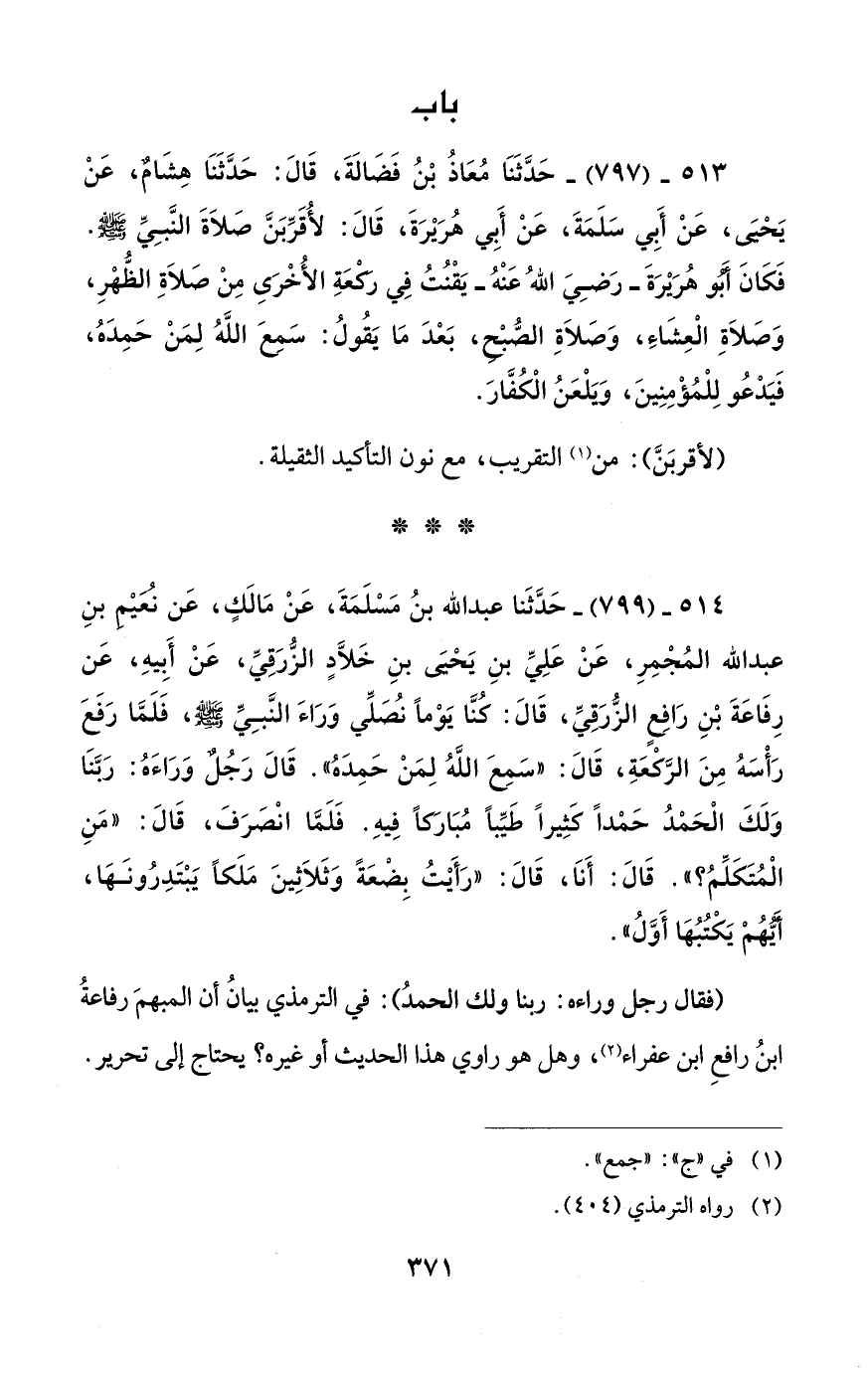 514 - (799) - حَدَّثَنا عبد الله بنُ مَسْلَمَةَ، عَنْ مَالَكٍ، عَن نُعَيْمٍ بنِ عبد الله المُجْمِرِ، عَنْ عَلِيِّ بنِ يَحْيَى بنِ خَلَّادٍ الزُّرَقِيِّ، عَنْ أَبيهِ، عَن رِفَاعَةَ بْنِ رَافِعٍ الزُّرَقيِّ، قَالَ: كُنَّا يَوْمًا نُصَلِّي وَرَاءَ النَّبِيِّ - صَلَّى الله عليه وسلم -، فَلَمَّا رَفَعَ رَأْسَهُ مِنَ الرَّكْعَةِ، قَالَ: "سَمِعَ اللهُ لِمَنْ حَمِدَهُ". قَالَ رَجُلٌ وَرَاءَهُ: رَبَّنَا وَلَكَ الْحَمْدُ حَمْدًا كَثِيرًا طَيِّبًا مُبَارَكًا فِيهِ. فَلَمَّا انْصَرَفَ، قَالَ: "مَنِ الْمُتَكَلِّمُ؟ ". قَالَ: أَناَ، قَالَ: "رَأَيْتُ بِضْعَةً وَثَلاَثِينَ مَلَكًا يَبْتَدِرُونَهَا، أيُّهُمْ يَكْتُبُهَا أَوَّلُ".