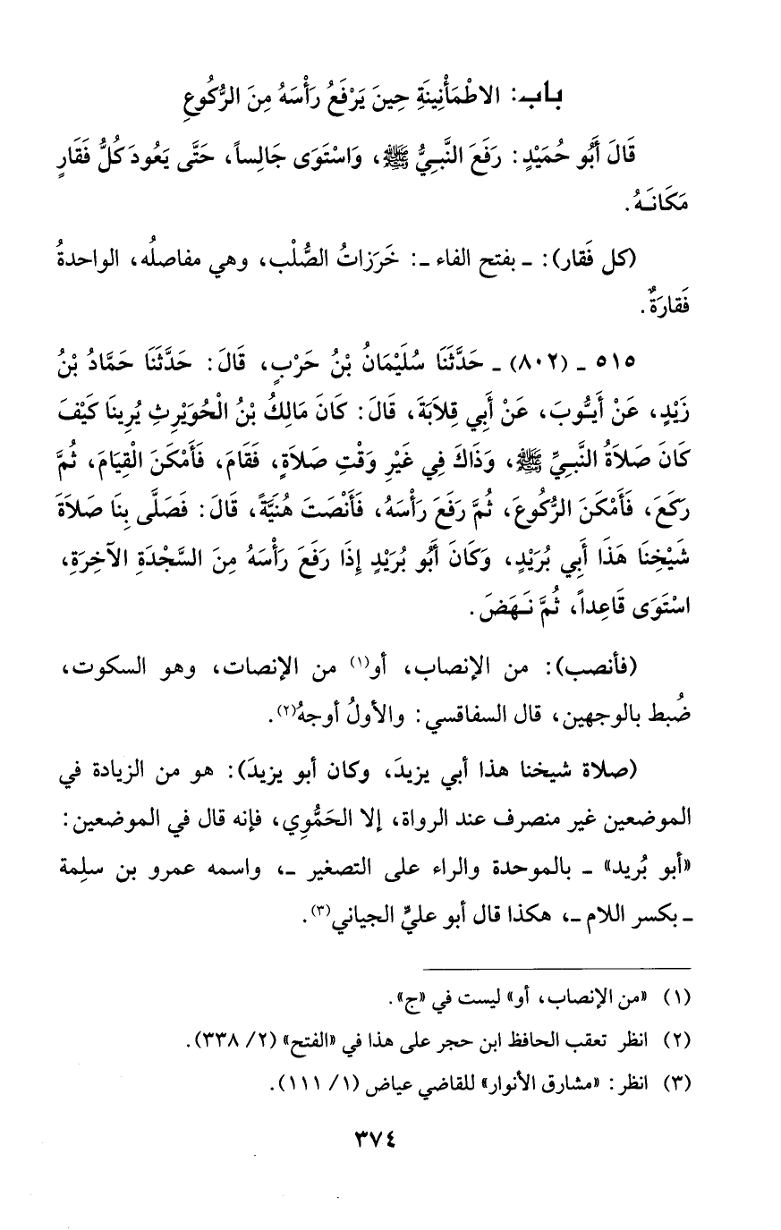 قَالَ أَبُو حُمَيْدٍ: رَفَعَ النَّبِيُّ - صَلَّى الله عليه وسلم -، وَاسْتَوَى جَالِسًا، حَتَّى يَعُودَ كُلُّ فَقَارٍ مَكَانَهُ.