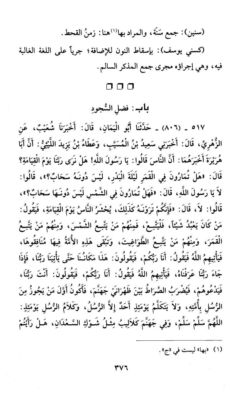 517 - (806) - حَدَّثَنَا أبو الْيَمَانِ، قَالَ: أَخْبَرَنَا شُعَيْبٌ، عَنِ الزُّهْرِيِّ، قَالَ: أَخْبَرَنِي سَعِيدُ بْنُ الْمُسَيَّبِ، وَعَطَاءُ بْنُ يَزِيدَ اللَّيْثيُّ: أَنَّ أَبَا هُرَيْرَةَ أَخْبَرَهُمَا: أَنَّ النَّاسَ قَالُوا: يَا رَسُولَ اللهِ! هَلْ نَرَى رَبَّنَا يَوْمَ الْقِيَامَةِ؟ قَالَ: "هَلْ تُمَارُونَ فِي الْقَمَرِ لَيْلَةَ الْبَدْرِ، لَيْسَ دُونَهُ سَحَابٌ؟ "، قَالُوا: لاَ يَا رَسُولَ اللهِ، قَالَ: "فَهَلْ تُمَارُونَ فِي الشَّمْسِ لَيْسَ دُونَهَا سَحَابٌ؟ "، قَالُوا: لاَ، قَالَ: "فَإِنَّكُمْ تَرَوْنَهُ كَذَلِكَ، يُحْشَرُ النَّاسُ يَوْمَ الْقِيَامَةِ، فَيقُولُ: مَنْ كَانَ يَعْبُدُ شَيْئًا، فَلْيَتَّبِعْ، فَمِنْهُمْ مَنْ يَتَّبعُ الشَّمْسَ، وَمِنْهُمْ مَنْ يتبعُ الْقَمَرَ، وَمِنْهُمْ مَنْ يَتَّبعُ الطَّوَاغِيتَ، وَتَبْقَى هَذِهِ الأُمَّةُ فِيهَا مُنَافِقُوهَا، فَيَأْتِيهِمُ اللهُ فَيقُولُ: أَناَ رَبكُّمْ، فَيقُولُونَ: هَذَا مَكَانُنَا حَتَّى يَأتِيَنَا رَبنَا، فَإِذَا جَاءَ رَبُّنَا عَرَفْنَاهُ، فَيَأْتِيهِمُ اللهُ فَيقُولُ: أَناَ رَبُّكُمْ، فَيقُولُونَ: أَنْتَ رَبُّنَا، فَيَدْعُوهُمْ، فَيُضْرَبُ الصِّرَاطُ بَيْنَ ظَهْرَاني جَهَنَّمَ، فَأكُونُ أَوَّلَ مَنْ يَجُوزُ مِنَ الرُّسُلِ بِأُمَّتِهِ، وَلاَ يَتَكَلَّمُ يَوْمَئِذٍ أَحَدٌ إِلَّا الرسُلُ، وَكَلاَمُ الرُّسُلِ يَوْمَئِذٍ: اللَّهُمَّ سَلِّمْ سَلِّمْ، وَفِي جَهَنَّمَ كَلاَلِيبُ مِثْلُ شَوْكِ السَّعْدَانِ، هَلْ رَأَيْتُمْ