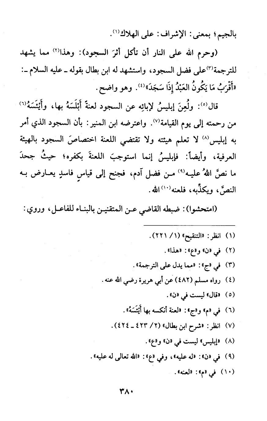 قال (¬5): ولُعِنَ إبليسُ لإبائِه عن السجود لعنةً أَبْلَسَهُ بها، وأَيْئَسَهُ (¬6) من رحمته إلى يوم القيامة (¬7). واعترضه ابن المنير: بأن السجود الذي أمر به إبليس (¬8) لا تعلم هيئته ولا تقتضي اللعنة اختصاصَ السجود بالهيئة العرفية، وأيضًا: فإبليسُ إنما استوجبَ اللعنةَ بكفره؛ حيثُ جحدَ ما نصَّ اللهُ عليه (¬9) من فضل آدم، فجنح إلى قياسٍ فاسدٍ يعارض به النصَّ، ويكذِّبه، فلعنه (¬10) الله.