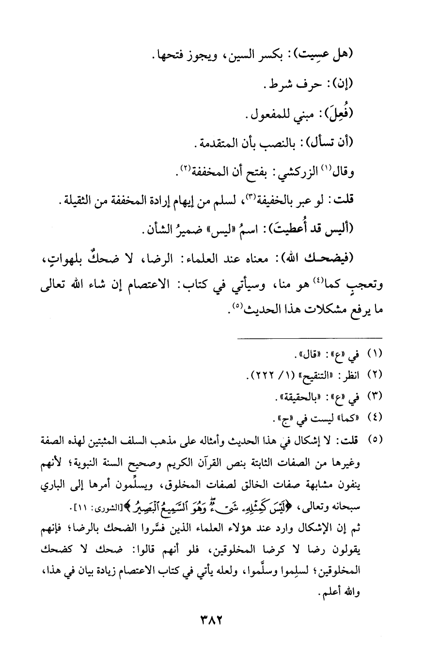 ثم إن الإشكال وارد عند هؤلاء العلماء الذين فسَّروا الضحك بالرضا؛ فإنهم يقولون رضا لا كرضا المخلوقين، فلو أنهم قالوا: ضحك لا كضحك المخلوقين؛ لسلِموا وسلَّموا، ولعله يأتي في كتاب الاعتصام زيادة بيان في هذا، والله أعلم.