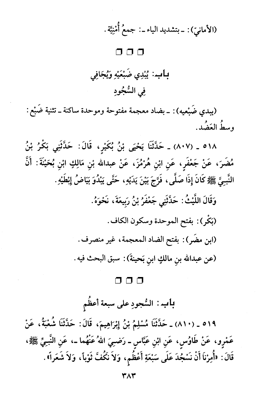 519 - (810) - حَدَّثَنَا مُسْلِمُ بْنُ إِبْرَاهِيمَ، قَالَ: حَدَّثَنَا شُعْبَةُ، عَنْ عَمْرٍو، عَنْ طَاوُسٍ، عَنِ ابْنِ عَبَّاسٍ -رَضِيَ اللهُ عَنْهُما-، عَنِ النَّبِيِّ - صلى الله عليه وسلم -، قَالَ: "أُمِرْناَ أَنْ نسجُدَ عَلَى سَبْعَةِ أَعْظُم، وَلاَ نكُفَّ ثَوْبًا، وَلاَ شَعَرًا".