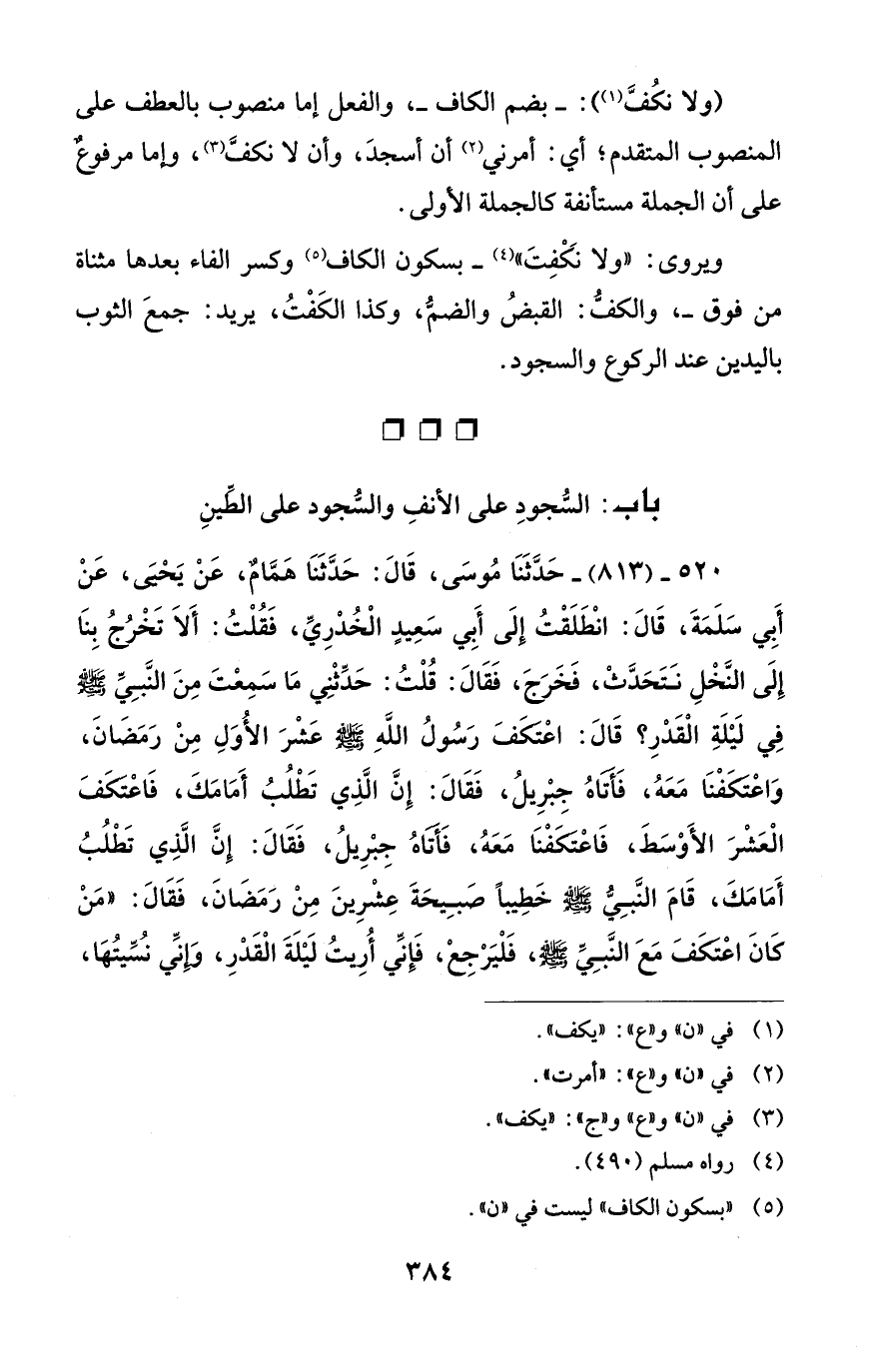 520 - (813) - حَدَّثَنَا مُوسَى، قَالَ: حَدَّثَنَا هَمَّامٌ، عَنْ يَحْيَى، عَنْ أَبِي سَلَمَةَ، قَالَ: انْطَلَقْتُ إلَى أَبِي سَعِيدٍ الْخُدْرِيِّ، فَقُلْتُ: أَلاَ تَخْرُجُ بِنَا إِلَى النَّخْلِ نَتَحَدَّثْ، فَخَرَجَ، فَقَالَ: قُلْتُ: حَدِّثْنِي مَا سَمِعْتَ مِنَ النَّبِيِّ - صلى الله عليه وسلم - فِي لَيْلَةِ الْقَدْرِ؟ قَالَ: اعْتكَفَ رَسُولُ الله - صَلَّى الله عليه وسلم - عَشْرَ الأُوَلِ مِنْ رَمَضَانَ، وَاعْتكَفْنَا مَعَهُ، فَأتاهُ جِبْرِيلُ، فَقَالَ: إِنَّ الَّذِي تَطْلُبُ أَمَامَكَ، فَاعْتكَفَ الْعَشْرَ الأَوْسَطَ، فَاعْتكَفْنَا مَعَهُ، فَأتاهُ جِبْرِيلُ، فَقَالَ: إِنَّ الَّذِي تَطْلُبُ أَمَامَكَ، قَامَ النَّبِيُّ - صلى الله عليه وسلم - خطِيبًا صَبِيحَةَ عِشْرِينَ مِنْ رَمَضَانَ، فَقَالَ: "مَنْ كَانَ اعْتكَفَ مَعَ النَّبِيِّ - صلى الله عليه وسلم -، فَلْيَرْجِعْ، فَإِنِّي أرُيتُ لَيْلَةَ الْقَدْرِ، وَإِنِّي نُسِّيتُهَا،