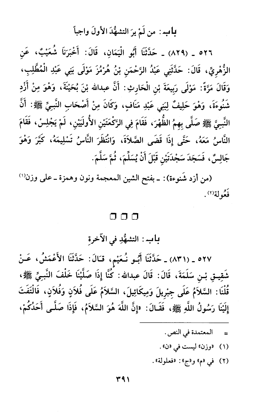 526 - (829) - حَدَّثَنَا أَبُو الْيَمَانِ، قَالَ: أَخْبَرَنَا شُعَيْبٌ، عَنِ الزُّهْرِيِّ، قَالَ: حَدَّثَنِي عَبْدُ الرَّحْمَنِ بْنُ هُرْمُزَ مَوْلَى بَنِي عَبْدِ الْمُطَّلِبِ، وَقَالَ مَرَّةً: مَوْلَى رَبِيعَةَ بْنِ الْحَارِثِ: أَنَّ عبد الله بْنَ بُحَيْنَةَ، وَهْوَ مِنْ أَزْدِ شَنُوءَةَ، وَهْوَ حَلِيفٌ لِبَنِي عَبْدِ مَنَافٍ، وَكَانَ مِنْ أَصْحَابِ النَّبِيِّ - صلى الله عليه وسلم -: أَنَّ النَّبِيَّ - صلى الله عليه وسلم - صَلَّى بِهِمُ الظُّهْرَ، فَقَامَ فِي الرَّكعَتَيْنِ الأُولَيَيْنِ، لَمْ يَجْلِسْ، فَقَامَ النَّاسُ مَعَهُ، حَتَّى إِذَا قَضَى الصَّلاَةَ، وَانتظَرَ النَّاسُ تَسْلِيمَهُ، كَبَّرَ وَهْوَ جَالِسٌ، فَسَجَدَ سَجْدَتَيْنِ قَبْلَ أَنْ يُسَلِّمَ، ثُمَّ سَلَّمَ.