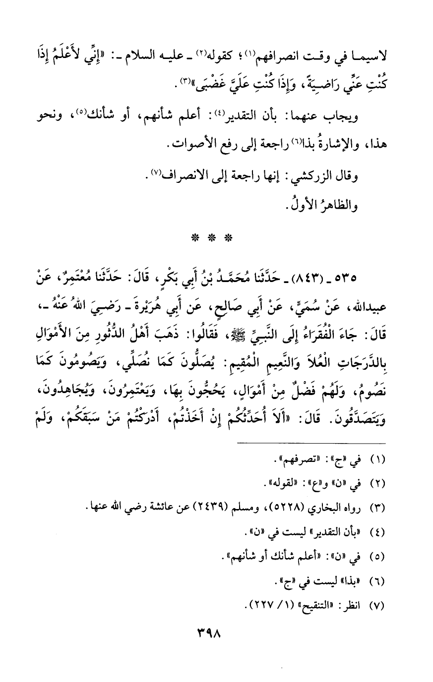 535 - (843) - حَدَّثَنا مُحَمَّدُ بْنُ أَبِي بَكْرٍ، قَالَ: حَدَّثَنا مُعْتَمِرٌ، عَنْ عبيد الله، عَنْ سُمَيٍّ، عَنْ أَبِي صَالح، عَن أَبِي هُرَيْرةَ -رَضِيَ اللهُ عَنْهُ-، قَالَ: جَاءَ الْفُقَرَاءُ إِلَى النَّبِيِّ - صلى الله عليه وسلم -، فَقَالُوا: ذَهَبَ أَهْلُ الدُّثُورِ مِنَ الأَمْوَالِ بِالدَّرَجَاتِ الْعُلاَ وَالنَّعِيم الْمُقِيم: يُصَلُّونَ كَمَا نُصَلِّي، وَيَصُومُونَ كَمَا نَصُومُ، وَلَهُمْ فَضْلٌ مِنْ أَمْوَالٍ، يَحُجُّونَ بِهَا، وَيَعْتَمِرُونَ، وَيُجَاهِدُونَ، وَيَتَصَدَّقُونَ. قالَ: "أَلاَ أُحَدِّثُكُمْ إِنْ أَخَذْتُمْ، أَدْركْتُمْ مَنْ سَبَقَكُمْ، وَلَمْ