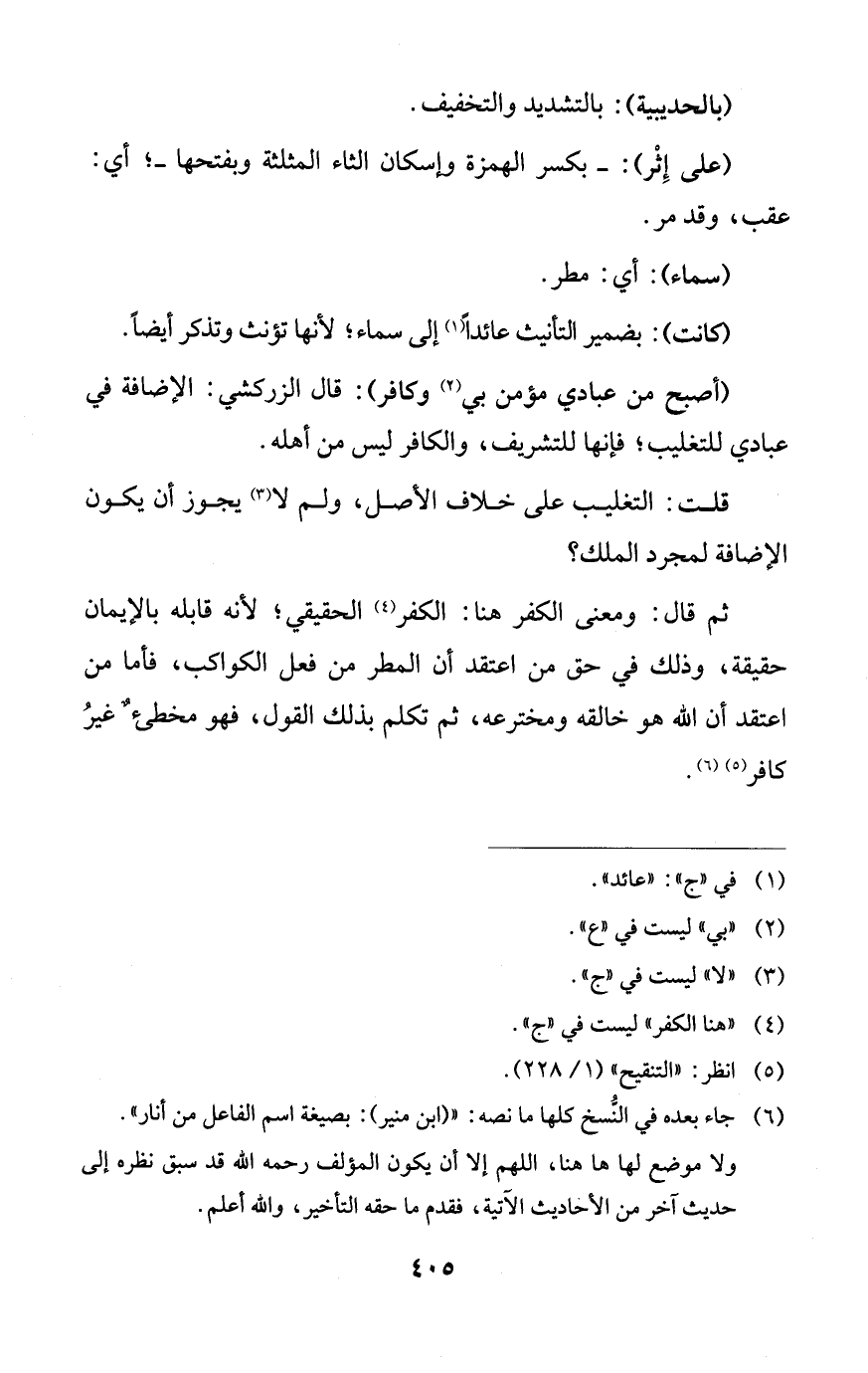 ثم قال: ومعنى الكفر هنا: الكفر (¬4) الحقيقي؛ لأنه قابله بالإيمان حقيقة، وذلك في حق من اعتقد أن المطر من فعل الكواكب، فأما من اعتقد أن الله هو خالقه ومخترعه، ثم تكلم بذلك القول، فهو مخطئٌ غيرُ كافر (¬5) (¬6).