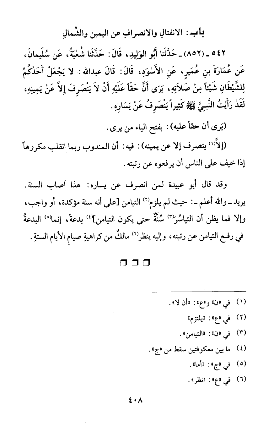 542 - (852) - حَدَّثَنا أَبُو الوَلِيدِ، قَالَ: حَدَّثَنا شُعْبَةُ، عَن سُلَيمانَ، عَن عُمَارَةَ بنِ عُمَيرٍ، عَنِ الأَسْوَدِ، قَالَ: قَالَ عبد الله: لا يَجْعَلْ أَحَدُكُمُ لِلشَّيْطَانِ شَيْئًا مِنْ صَلاَتِهِ، يَرَى أَنَّ حَقًّا عَلَيْهِ أَنْ لاَ يَنْصَرِفَ إِلَّا عَنْ يَمِينِهِ، لَقَدْ رَأَيْتُ النَّبِيَّ - صلى الله عليه وسلم - كَثِيرًا يَنْصَرِفُ عَنْ يَسَارِهِ.