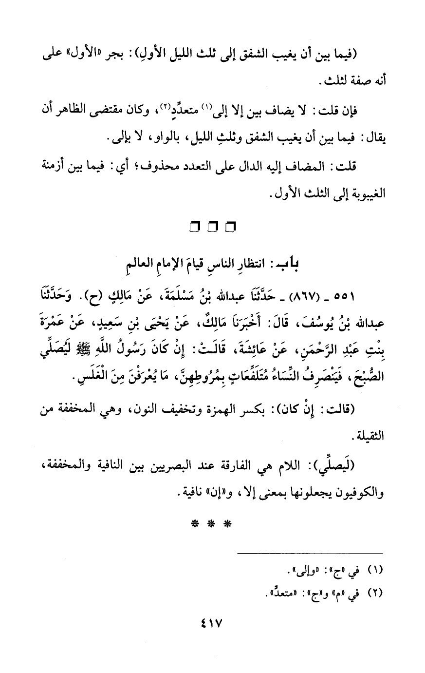 551 - (867) - حَدَّثَنَا عبد الله بْنُ مَسْلَمَةَ، عَنْ مَالِكٍ (ح). وَحَدَّثَنَا عبد الله بْنُ يُوسُفَ، قَالَ: أَخْبَرَنَا مَالِكٌ، عَنْ يَحْيَى بْنِ سَعِيدٍ، عَنْ عَمْرَةَ بِنْتِ عَبْدِ الرَّحْمَنِ، عَنْ عَائِشَةَ، قَالَتْ: إِنْ كَانَ رَسُولُ اللَّهِ - صلى الله عليه وسلم - لَيُصَلِّي الصُّبْحَ، فَيَنْصَرِفُ النِّسَاءُ مُتَلَفِّعَاتٍ بِمُرُوطِهِنَّ، مَا يُعْرَفْنَ مِنَ الْغَلَسِ.