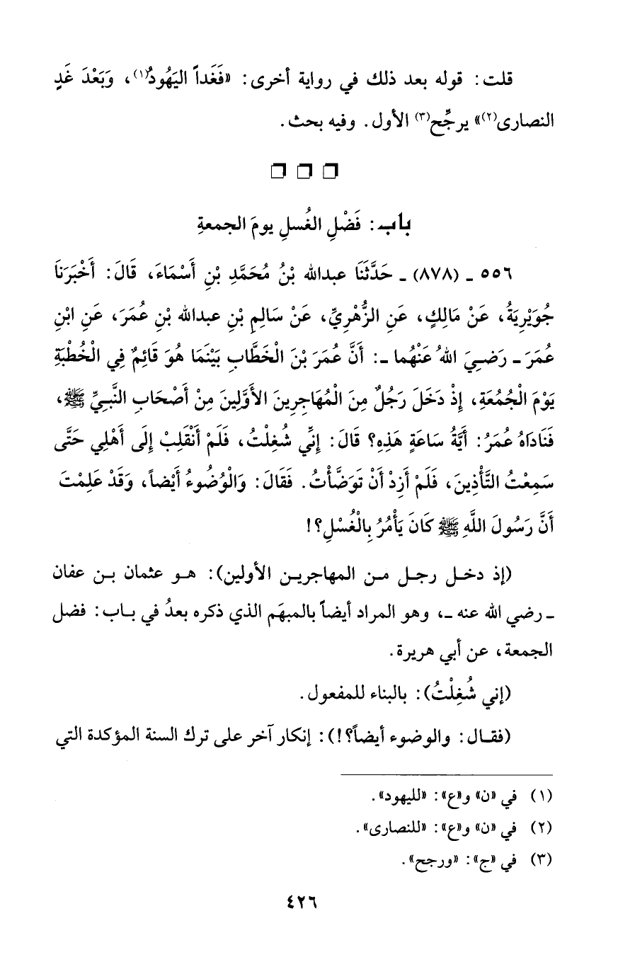 556 - (878) - حَدَّثَنَا عبد الله بْنُ مُحَمَّدِ بْنِ أَسْمَاءَ، قَالَ: أَخْبَرَنَا جُويرِيَةُ، عَنْ مَالِكٍ، عَنِ الزُّهْرِيِّ، عَنْ سَالِم بْنِ عبد الله بْنِ عُمَرَ، عَنِ ابْنِ عُمَرَ - رَضِيَ اللهُ عَنْهُما -: أَنَّ عُمَرَ بْنَ الْخَطَّابِ بَيْنَمَا هُوَ قَائِمٌ فِي الْخُطْبَةِ يَوْمَ الْجُمُعَةِ، إِذْ دَخَلَ رَجُلٌ مِنَ الْمُهَاجِرِينَ الأَوَّلِينَ مِنْ أَصْحَابِ النَّبِيِّ - صلى الله عليه وسلم -، فَنَادَاهُ عُمَرُ: أَيَّةُ سَاعَةٍ هَذِهِ؟ قَالَ: إنِّي شُغِلْتُ، فَلَمْ أَنْقَلِبْ إِلَى أَهْلِي حَتَّى سَمِعْتُ التَّأْذِينَ، فَلَمْ أَزِدْ أَنْ تَوَضَّأْتُ. فَقَالَ: وَالْوُضُوءُ أَيْضًا، وَقَدْ عَلِمْتَ أَنَّ رَسُولَ اللَّهِ - صلى الله عليه وسلم - كانَ يَأْمُرُ بِالْغُسْلِ؟!