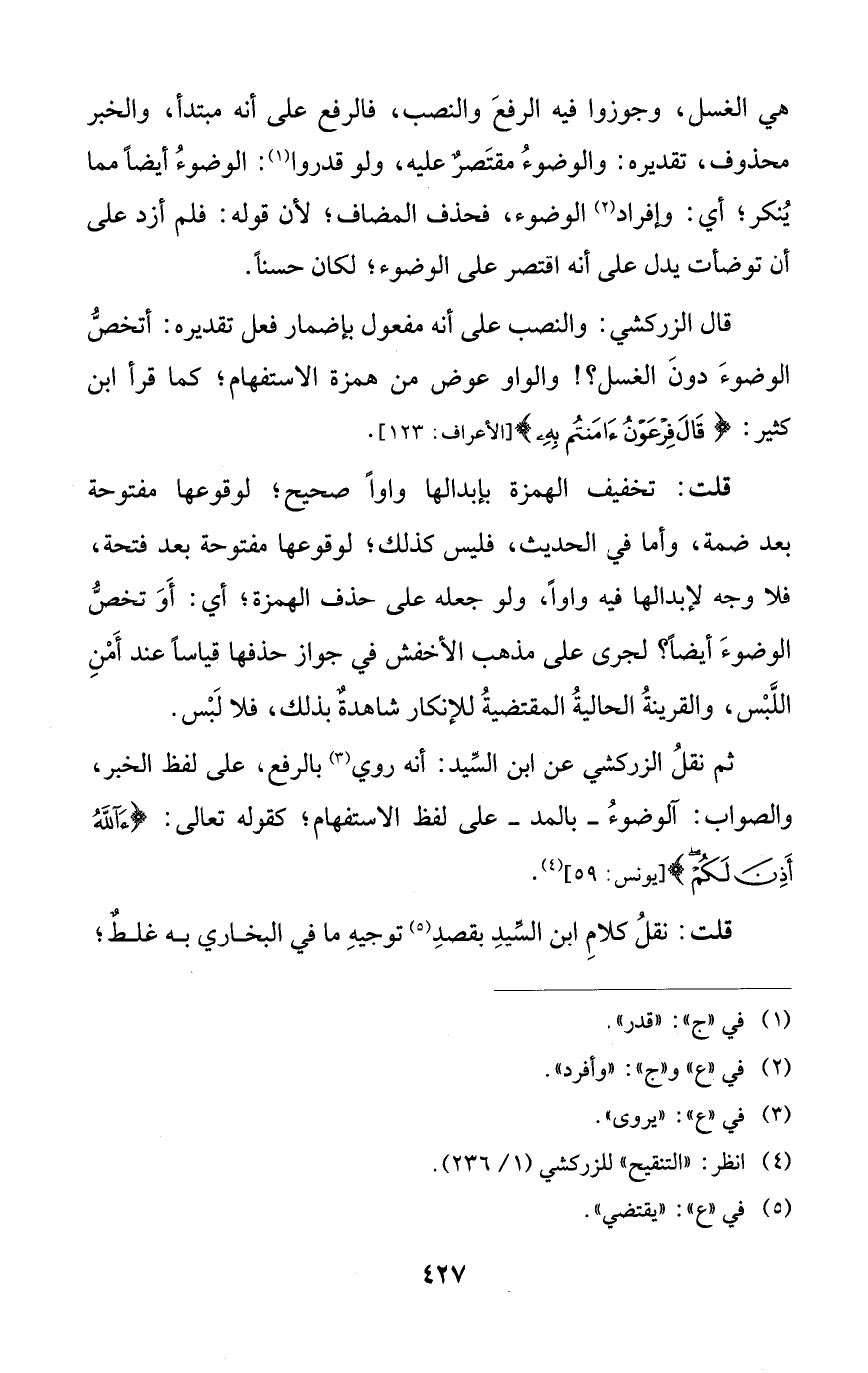 ثم نقلُ الزركشي عن ابن السِّيد: أنه روي (¬3) بالرفع، على لفظ الخبر، والصواب: آلوضوءُ -بالمد- على لفظ الاستفهام؛ كقوله تعالى: {ءَآللَّهُ أَذِنَ لَكُمْ} [يونس: 59] (¬4).