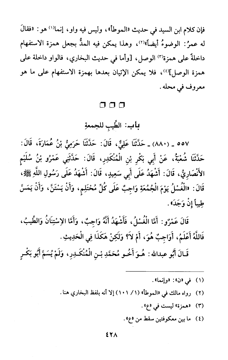 557 - (880) - حَدَّثَنَا عَلِيٌّ، قَالَ: حَدَّثَنَا حَرَمِيُّ بْنُ عُمَارَةَ، قَالَ: حَدَّثَنَا شُعْبَةُ، عَنْ أَبي بَكْرِ بْنِ الْمُنْكَدِرِ، قَالَ: حَدَّثَنِي عَمْرُو بْنُ سُلَيْمٍ الأَنْصَارِيُّ، قَالَ: أَشْهَدُ عَلَى أَبِي سَعِيدٍ، قَالَ: أَشْهَدُ عَلَى رَسُولِ اللَّهِ - صلى الله عليه وسلم -، قَالَ: "الْغُسْلُ يَوْمَ الْجُمُعَةِ وَاجِبٌ عَلَى كُلِّ مُحْتَلِمٍ، وَأَنْ يَسْتَنَّ، وَأَنْ يَمَسَّ طِيبًا إِنْ وَجَدَ".