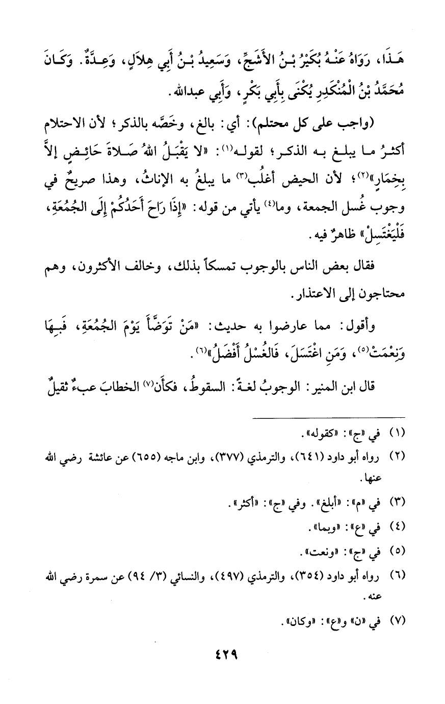 (واجب على كل محتلم): أي: بالغ، وخَصَّه بالذكر؛ لأن الاحتلام أكثرُ ما يبلغ به الذكر؛ لقوله (¬1): "لا يَقْبَلُ اللهُ صَلاةَ حَائِضٍ إلَّا بِخِمَارٍ" (¬2)؛ لأن الحيض أغلُب (¬3) ما يبلغُ به الإناثُ، وهذا صريحٌ في وجوب غُسل الجمعة، وما (¬4) يأتي من قوله: "إِذَا رَاحَ أَحَدُكُمْ إِلَى الجُمُعَةِ، فَلْيَغْتَسِلْ" ظاهرٌ فيه.