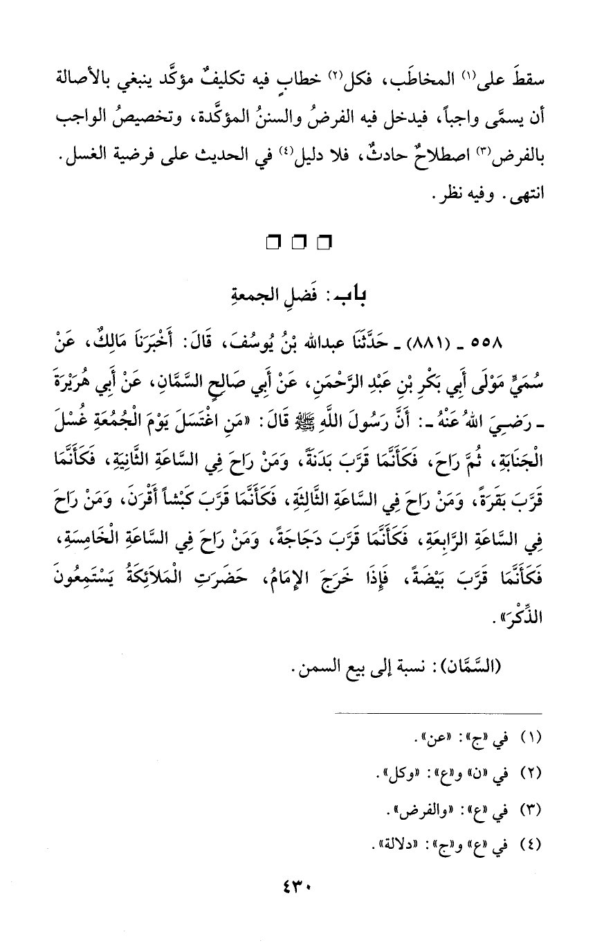 558 - (881) - حَدَّثَنَا عبد الله بْنُ يُوسُفَ، قَالَ: أَخْبَرَنَا مَالِكٌ، عَنْ سُمَيٍّ مَوْلَى أَبي بَكْرِ بْنِ عَبْدِ الرَّحْمَنِ، عَنْ أَبي صَالِحٍ السَّمَّانِ، عَنْ أَبي هُرَيْرَةَ - رَضِيَ اللهُ عَنْهُ -: أَنَّ رَسُولَ اللهِ - صلى الله عليه وسلم - قَالَ. "مَنِ اغْتَسَلَ يَوْمَ الْجُمُعَةِ غُسْلَ الْجَنَابَةِ، ثُمَّ رَاحَ، فَكَأَنَّمَا قَرَّبَ بَدَنَةً، وَمَنْ رَاحَ فِي السَّاعَةِ الثَّانِيَةِ، فَكَأَنَّمَا قَرَّبَ بَقَرَةً، وَمَنْ رَاحَ فِي السَّاعَةِ الثَّالِثَةِ، فَكَأَنَّمَا قَرَّبَ كَبْشًا أَقْرَنَ، وَمَنْ رَاحَ فِي السَّاعَةِ الرَّابِعَةِ، فَكَأَنَّمَا قَرَّبَ دَجَاجَةً، وَمَنْ رَاحَ فِي السَّاعَةِ الْخَامِسَةِ، فَكَأَنَّمَا قَرَّبَ بَيْضَةً، فَإِذَا خَرَجَ الإِمَامُ، حَضَرَتِ الْمَلاَئِكَةُ يَسْتَمِعُونَ الذِّكْرَ".