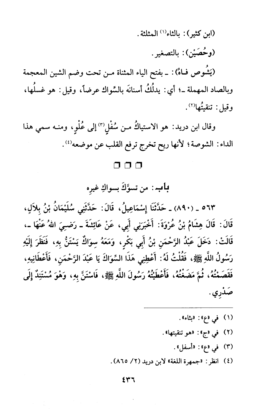 563 - (890) - حَدَّثَنَا إِسْمَاعِيلُ، قَالَ: حَدَّثَنِي سُلَيْمَانُ بْنُ بِلاَلٍ، قَالَ: قَالَ هِشَامُ بْنُ عُرْوَةَ: أَخْبَرَنِي أَبِي، عَنْ عَائِشَةَ - رَضِيَ اللهُ عَنْهَا -، قَالَتْ: دَخَلَ عَبْدُ الرَّحْمَنِ بْنُ أَبي بَكْرٍ، وَمَعَهُ سِوَاكٌ يَسْتَنُّ بِهِ، فَنَظَرَ إِلَيْهِ رَسُولُ اللَّهِ - صلى الله عليه وسلم -، فَقُلْتُ لَهُ: أَعْطِنِي هَذَا السِّوَاكَ يَا عَبْدَ الرَّحْمَنِ، فَأَعْطَانِيهِ، فَقَصَمْتُهُ، ثُمَّ مَضَغْتُهُ، فَأَعْطَيْتُهُ رَسُولَ اللَّهِ - صلى الله عليه وسلم -، فَاسْتَنَّ بِهِ، وَهْوَ مُسْتَنِدٌ الَى صَدْرِي.