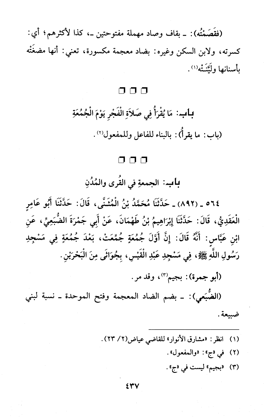 564 - (892) - حَدَّثَنَا مُحَمَّدُ بْنُ الْمُثَنَّى، قَالَ: حَدَّثَنَا أَبُو عَامِرٍ الْعَقَدِيُّ، قَالَ: حَدَّثَنَا إِبْرَاهِيمُ بْنُ طَهْمَانَ، عَنْ أَبِي جَمْرَةَ الضُّبَعِيِّ، عَنِ ابْنِ عَبَّاسٍ: أَنَّهُ قَالَ: إِنَّ أَوَّلَ جُمُعَةٍ جُمِّعَتْ، بَعْدَ جُمُعَةٍ فِي مَسْجدِ رَسُولِ اللهِ - صلى الله عليه وسلم -، فِي مَسْجدِ عَبْدِ الْقَيْسِ، بِجُوَاثَى مِنَ الْبَحْرَيْنِ.