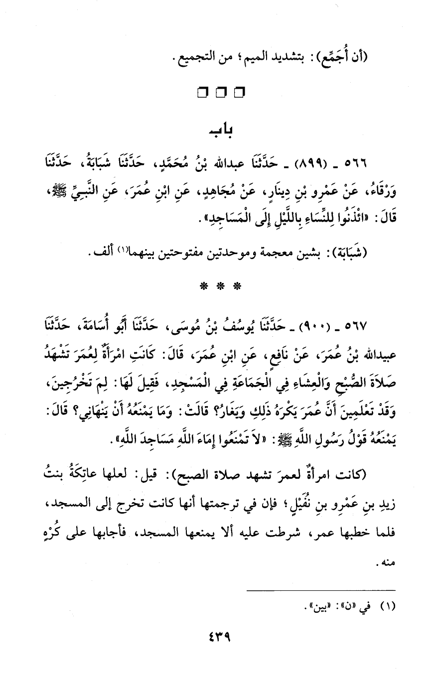 566 - (899) - حَدَّثَنَا عبد الله بْنُ مُحَمَّدٍ، حَدَّثَنَا شَبَابَةُ، حَدَّثَنَا وَرْقَاءُ، عَنْ عَمْرِو بْنِ دِينَارٍ، عَنْ مُجَاهِدٍ، عَنِ ابْنِ عُمَرَ، عَنِ النَّبِيِّ - صلى الله عليه وسلم -، قَالَ: "ائْذَنُوا لِلنِّسَاءَ بِاللَّيْلِ إِلَى الْمَسَاجِدِ".