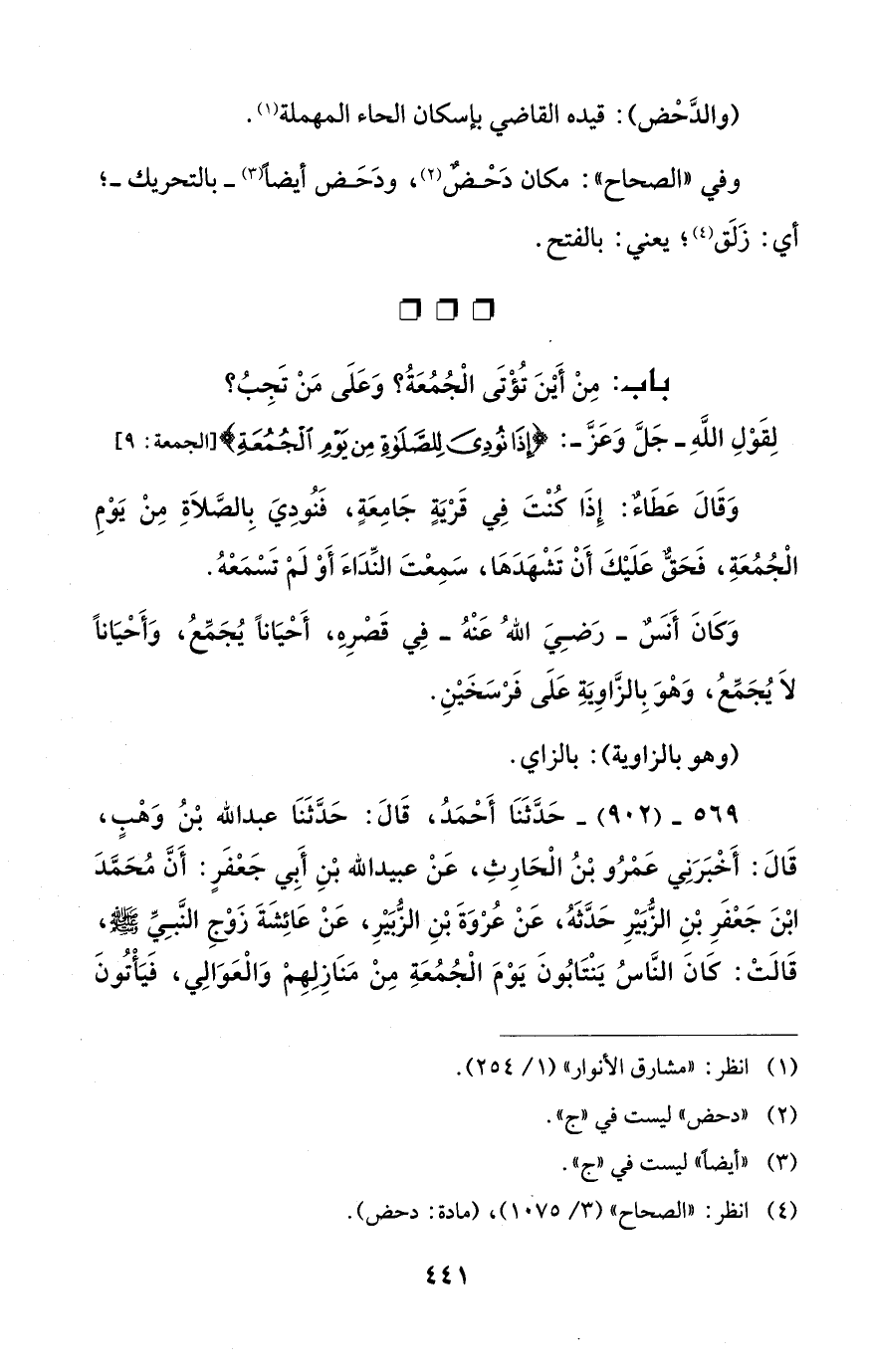 569 - (902) - حَدَّثَنَا أَحْمَدُ، قَالَ: حَدَّثَنَا عبد الله بْنُ وَهْبٍ، قَالَ: أَخْبَرَنِي عَمْرُو بْنُ الْحَارِثِ، عَنْ عبيد الله بْنِ أَبِي جَعْفَرٍ: أَنَّ مُحَمَّدَ ابْنَ جَعْفَرِ بْنِ الزُّبَيْرِ حَدَّثَهُ، عَنْ عُرْوَةَ بْنِ الزُّبَيْرِ، عَنْ عَائِشَةَ زَوْجِ النَّبِيِّ - صلى الله عليه وسلم -، قَالَتْ: كَانَ النَّاسُ يَنْتَابُونَ يَوْمَ الْجُمُعَةِ مِنْ مَنَازِلِهِمْ وَالْعَوَالِي، فَيَأْتُونَ