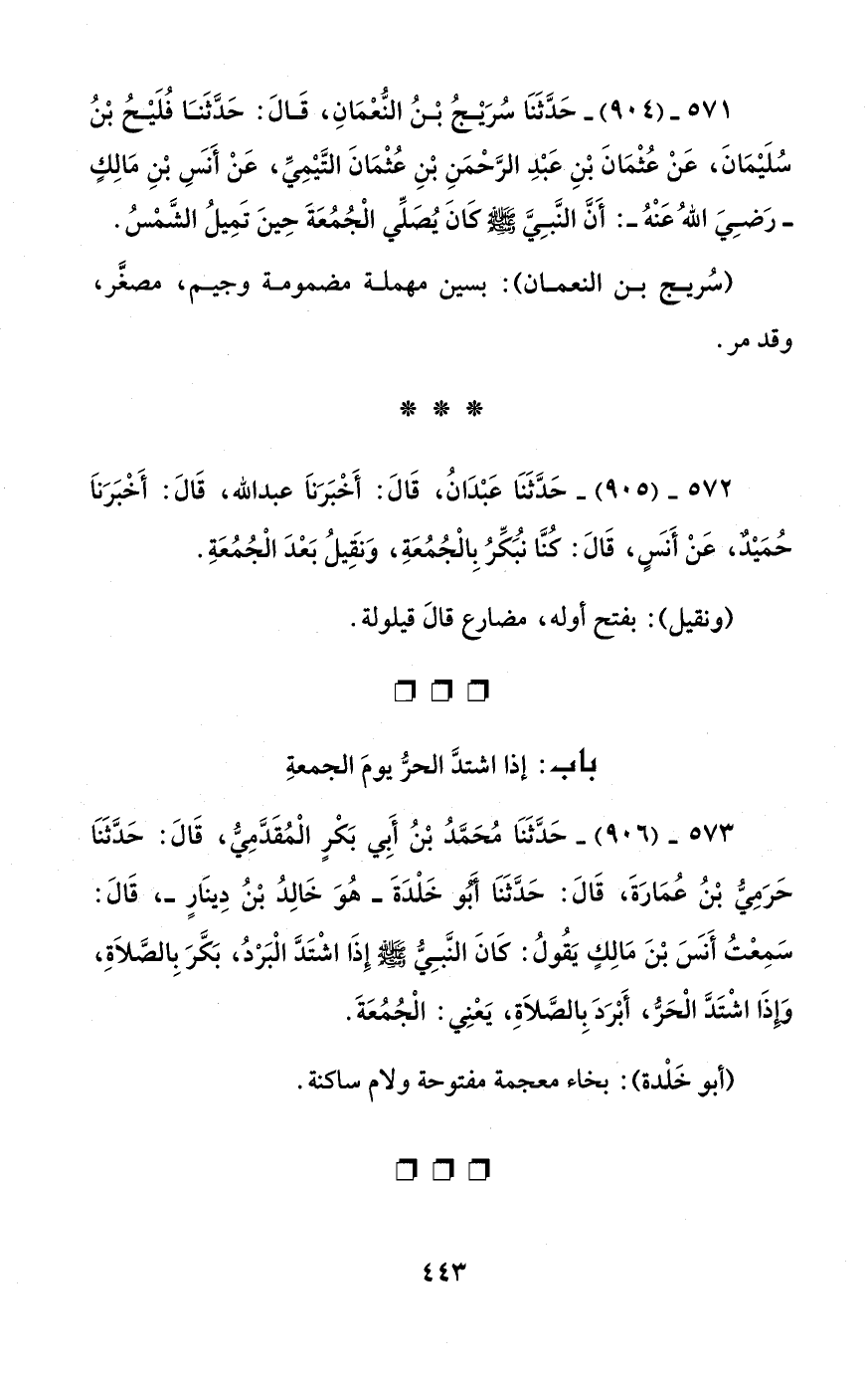 571 - (954) - حَدَّثَنَا سُرَيْجُ بْنُ النُّعْمَانِ، قَالَ: حَدَّثَنَا فُلَيْحُ بْنُ سُلَيْمَانَ، عَنْ عُثْمَانَ بْنِ عَبْدِ الرَّحْمَنِ بْنِ عُثْمَانَ التَّيْمِيِّ، عَنْ أَنس بْنِ مَالِكٍ - رَضِيَ اللهُ عَنْهُ -: أَنَّ النَّبِيَّ - صلى الله عليه وسلم - كَانَ يُصَلِّي الْجُمُعَةَ حِينَ تَمِيلُ الشَّمْسُ.