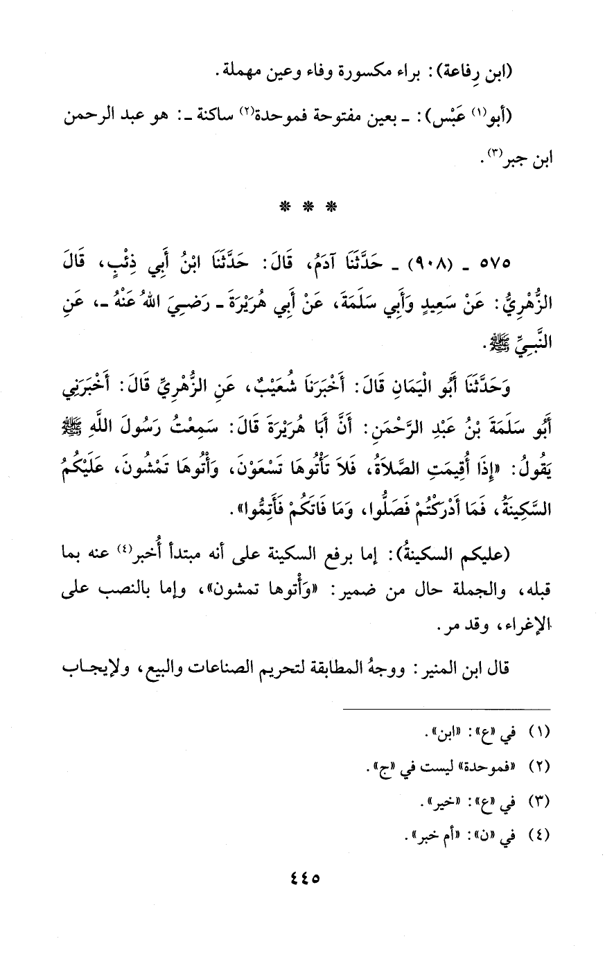 575 - (908) - حَدَّثَنَا آدَمُ، قَالَ: حَدَّثَنَا ابْنُ أَبِي ذِئْبٍ، قَالَ الزُّهْرِيُّ: عَنْ سَعِيدٍ وَأَبي سَلَمَةَ، عَنْ أَبي هُرَيْرَةَ - رَضِيَ اللهُ عَنْهُ -، عَنِ النَّبِيِّ - صلى الله عليه وسلم -.
