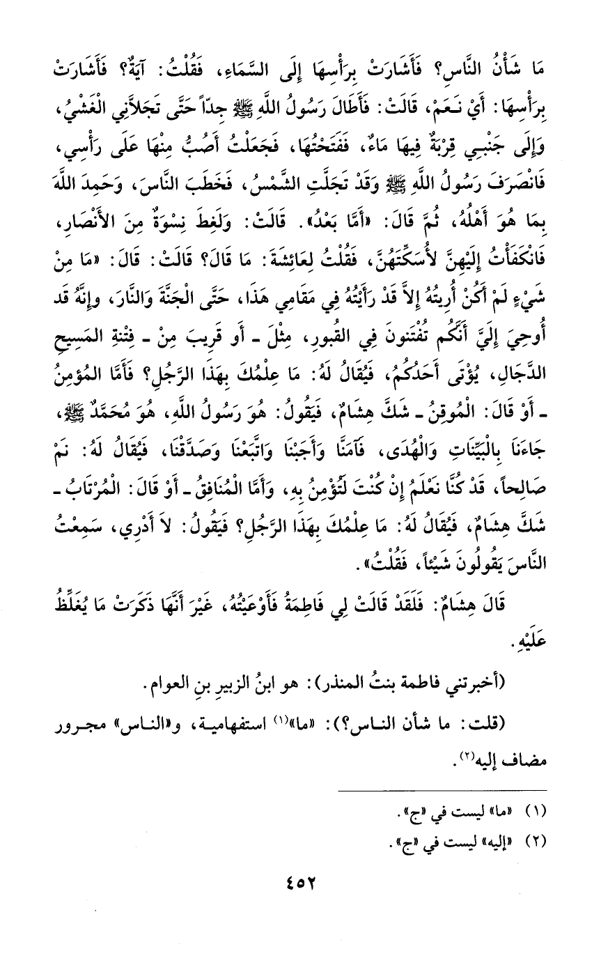 مَا شَأْنُ النَّاسِ؟ فَأَشَارَتْ بِرَأْسِهَا إِلَى السَّمَاءِ، فَقُلْتُ: آيَةٌ؟ فَأَشَارَتْ بِرَأْسِهَا: أَيْ نَعَمْ، قَالَتْ: فَأَطَالَ رَسُولُ اللَّهِ - صلى الله عليه وسلم - جِدًّا حَتَّى تَجَلَّانِي الْغَشْيُ، وَإِلَى جَنْبِي قِرْبَةٌ فِيهَا مَاءٌ، فَفَتَحْتُهَا، فَجَعَلْتُ أَصُبُّ مِنْهَا عَلَى رَأْسِي، فَانْصرَفَ رَسُولُ اللَّهِ - صلى الله عليه وسلم - وَقَدْ تَجَلَّتِ الشَّمْسُ، فَخَطَبَ النَّاسَ، وَحَمِدَ اللَّهَ بِمَا هُوَ أَهْلُهُ، ثُمَّ قَالَ: "أَمَّا بَعْدُ". قَالَتْ: وَلَغِطَ نِسْوَةٌ مِنَ الأَنْصَارِ، فَانْكَفَأْتُ إِلَيْهِنَّ لأُسَكِّتَهُنَّ، فَقُلْتُ لِعَائِشَةَ: مَا قَالَ؟ قَالَتْ: قَالَ: "مَا مِنْ شَيْءٍ لَمْ أَكُنْ أُرِيتُهُ إِلَّا قَدْ رَأَيْتُهُ فِي مَقَامِي هَذَا، حَتَّى الْجَنَّةَ وَالنَّارَ، وإِنَّهُ قَد أُوحِيَ إِلَيَّ أَنَّكُم تُفْتَنونَ فِي القُبورِ، مِثْلَ -أَو قَرِيبَ مِنْ- فِتْنةِ المَسِيح الدَّجَالِ، يُؤْتَى أَحَدُكُمُ، فَيُقَالُ لَهُ: مَا عِلْمُكَ بِهَذَا الرَّجُلِ؟ فَأَمَّا المُؤمِنُ -أَوْ قَالَ: الْمُوقِنُ- شَكَّ هِشَامٌ، فَيقُولُ: هُوَ رَسُولُ اللَّهِ، هُوَ مُحَمَّدٌ - صلى الله عليه وسلم -، جَاءَناَ بِالْبيِّنَاتِ وَالْهُدَى، فَآمَنَّا وَأَجَبْنَا وَاتَّبَعْنَا وَصَدَّقْنَا، فَيُقَالُ لَهُ: نَمْ صَالِحًا، قَدْ كُنَّا نَعْلَمُ إِنْ كُنْتَ لَتُؤْمِنُ بِهِ، وَأَمَّا الْمُنَافِقُ -أَوْ قَالَ: الْمُرْتَابُ- شَكَّ هِشَامٌ، فَيُقَالُ لَهُ: مَا عِلْمُكَ بِهَذَا الرَّجُلِ؟ فَيَقُولُ: لاَ أَدْرِي، سَمِعْتُ النَّاسَ يَقُولُونَ شَيْئًا، فَقُلْتُ".