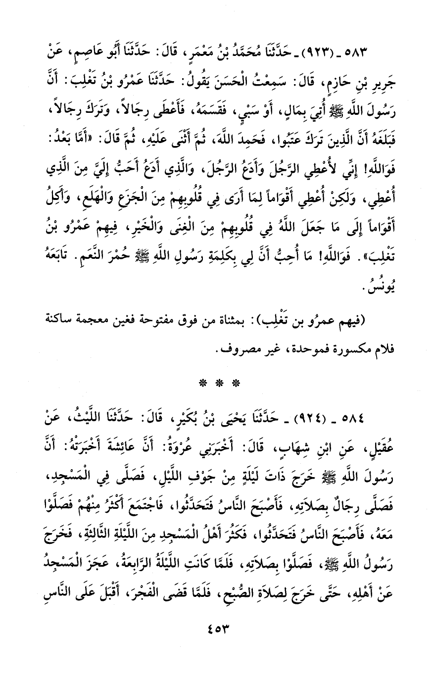 583 - (923) - حَدَّثَنَا مُحَمَّدُ بْنُ مَعْمَرٍ، قَالَ: حَدَّثَنَا أَبُو عَاصِمٍ، عَنْ جَرِيرِ بْنِ حَازِمٍ، قَالَ: سَمِعْتُ الْحَسَنَ يَقُولُ: حَدَّثَنَا عَمْرُو بْنُ تَغْلِبَ: أَنَّ رَسُولَ اللَّهِ - صلى الله عليه وسلم - أُتِيَ بِمَالٍ، أَوْ سَبْيٍ، فَقَسَمَهُ، فَأَعْطَى رِجَالًا، وَتَرَكَ رِجَالًا، فَبَلَغَهُ أَنَّ الَّذِينَ تَرَكَ عَتَبُوا، فَحَمِدَ اللَّهَ، ثُمَّ أَثْنَى عَلَيْهِ، ثُمَّ قَالَ: "أَمَّا بَعْدُ: فَوَاللَّهِ! إِنِّي لأُعْطِي الرَّجُلَ وَأَدَعُ الرَّجُلَ، وَالَّذِي أَدَعُ أَحَبُّ إِلَيَّ مِنَ الَّذِي أُعْطِي، وَلَكِنْ أُعْطِي أَقْوَامًا لِمَا أَرَى فِي قُلُوبِهِمْ مِنَ الْجَزَعِ وَالْهَلَعِ، وَأَكِلُ أَقْوَامًا إِلَى مَا جَعَلَ اللَّهُ فِي قُلُوبِهِمْ مِنَ الْغِنَى وَالْخَيْرِ، فِيهِمْ عَمْرُو بْنُ تَغْلِبَ". فَوَاللَّهِ! مَا أُحِبُّ أَنَّ لِي بِكَلِمَةِ رَسُولِ اللَّهِ - صلى الله عليه وسلم - حُمْرَ النَّعَمِ. تَابَعَهُ يُونُسُ.