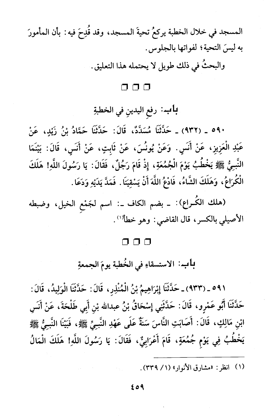 590 - (932) - حَدَّثَنَا مُسَدَّد، قَالَ: حَدَّثَنَا حَمَّادُ بْنُ زَيْدٍ، عَنْ عَبْدِ الْعَزِيزِ، عَنْ أَنسَ. وَعَنْ يُونسُ، عَنْ ثَابِتٍ، عَنْ أَنسَ، قَالَ: بَيْنَمَا النَّبِيُّ - صلى الله عليه وسلم - يَخْطُبُ يَوْمَ الْجُمُعَةِ، إِذْ قَامَ رَجُل، فَقَالَ: يَا رَسُولَ اللَّهِ! هَلَكَ الْكُرَاعُ، وَهَلَكَ الشَّاءُ، فَادع اللَّهَ أَنْ يَسْقِيَنَا. فَمَدَّ يَدَيْهِ وَدَعَا.