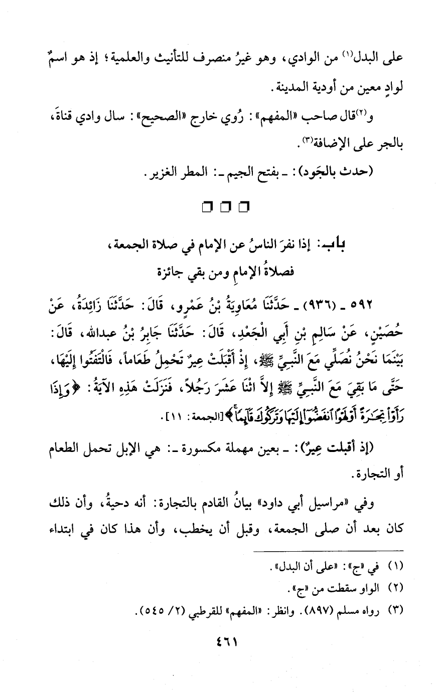 592 - (936) - حَدَّثَنَا مُعَاوِيَةُ بْنُ عَمْرٍو، قَالَ: حَدَّثَنَا زَائِدَةُ، عَنْ حُصَيْنٍ، عَنْ سَالِمِ بْنِ أَبِي الْجَعْدِ، قَالَ: حَدَّثَنَا جَابِرُ بْنُ عبد الله، قَالَ: بَيْنَمَا نَحْنُ نُصَلِّي مَعَ النَّبِيِّ - صلى الله عليه وسلم -، إِذْ أَقْبَلَتْ عِيرٌ تَحْمِلُ طَعَاماً، فَالْتَفَتُوا إِلَيْهَا، حَتَّى مَا بَقِيَ مَعَ النَّبِيِّ - صلى الله عليه وسلم - إِلاَّ اثْنَا عَشَرَ رَجُلاً، فَنَزَلَتْ هَذهِ الآيَةُ: {وَإِذَا رَأَوْا تِجَارَةً أَوْ لَهْوًا انْفَضُّوا إِلَيْهَا وَتَرَكُوكَ قَائِمًا} [الجمعة: 11].
