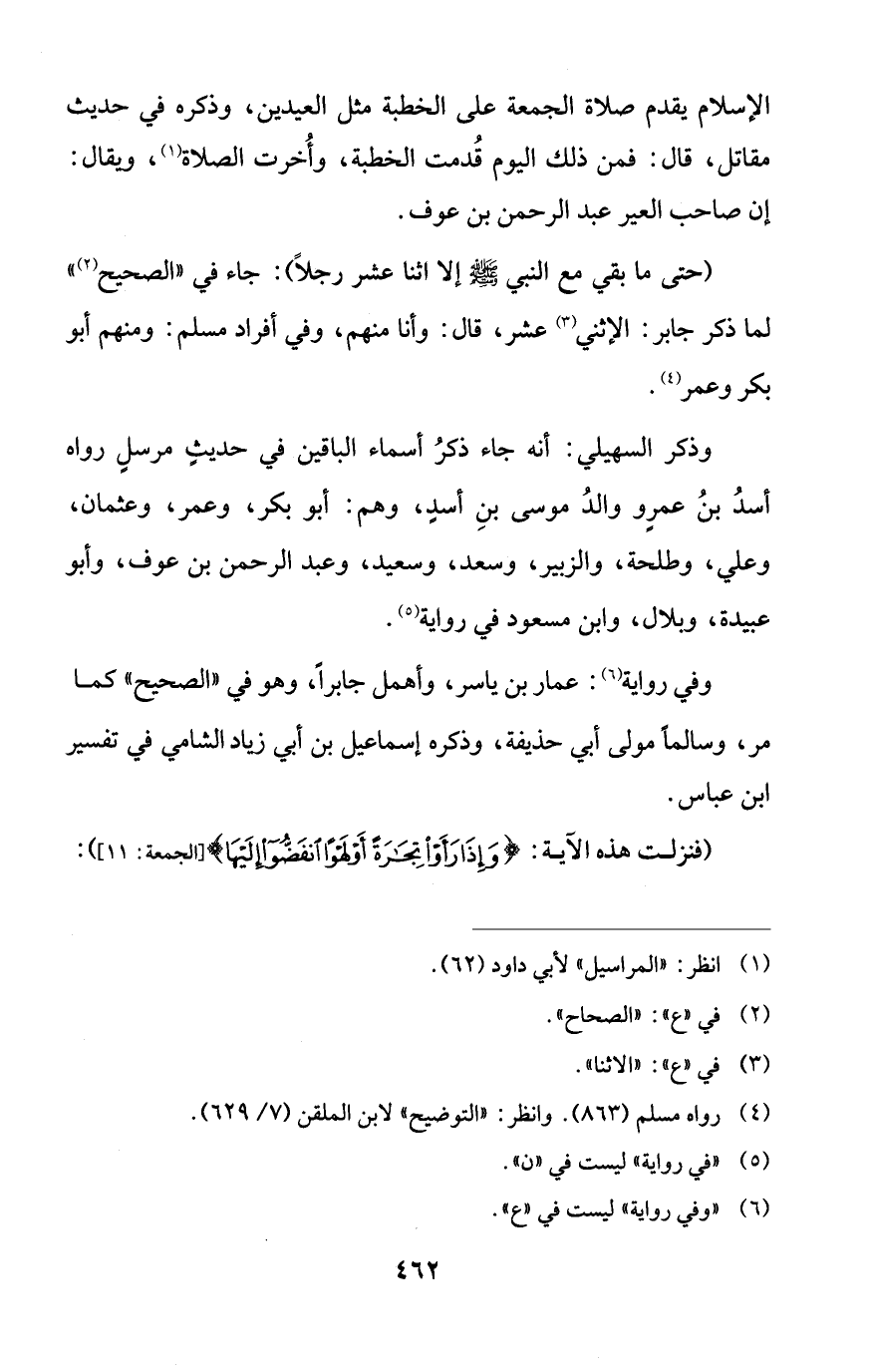 الإسلام يقدم صلاة الجمعة على الخطبة مثل العيدين، وذكره في حديث مقاتل، قال: فمن ذلك اليوم قُدمت الخطبة، وأُخرت الصلاة (¬1)، ويقال: إن صاحب العير عبد الرحمن بن عوف.