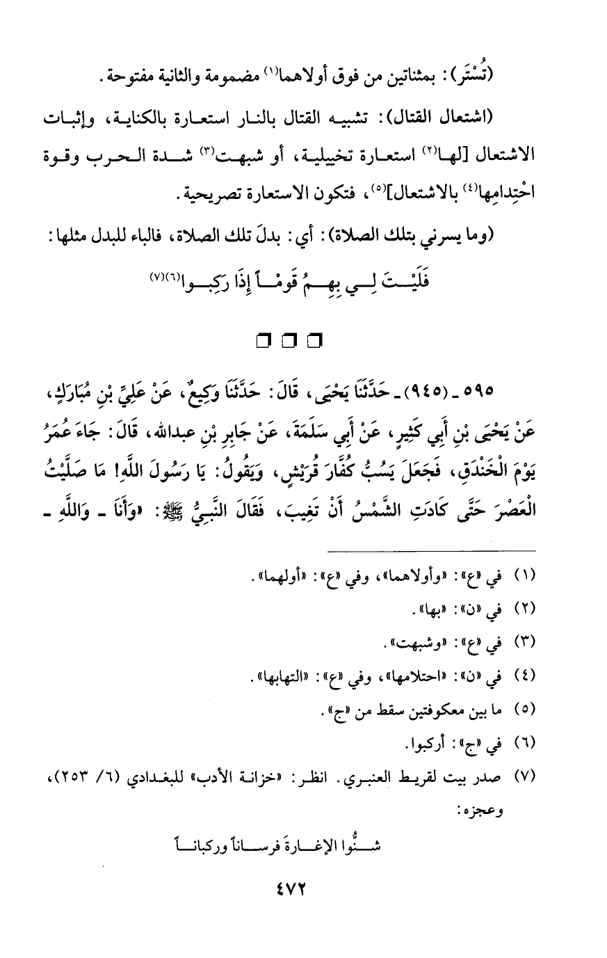 595 - (945) - حَدَّثَنَا يَحْيَى، قَالَ: حَدَّثَنَا وَكيع، عَنْ عَلِيِّ بْنِ مُبَارَكٍ، عَنْ يَحْيَى بْنِ أَبِي كَثِيرٍ، عَنْ أَبِي سَلَمَةَ، عَنْ جَابِرِ بْنِ عبد الله، قَالَ: جَاءَ عُمَرُ يَوْمَ الْخَنْدَقِ، فَجَعَلَ يَسُبُّ كفَّارَ قُرَيْشٍ، وَيَقُولُ: يَا رَسُولَ اللَّهِ! مَا صَلَّيْتُ الْعَصْرَ حَتَى كَادَتِ الشَّمْسُ أَنْ تَغِيبَ، فَقَالَ النَّبِيَّ - صلى الله عليه وسلم -: "وَأَناَ - وَاللَّهِ -