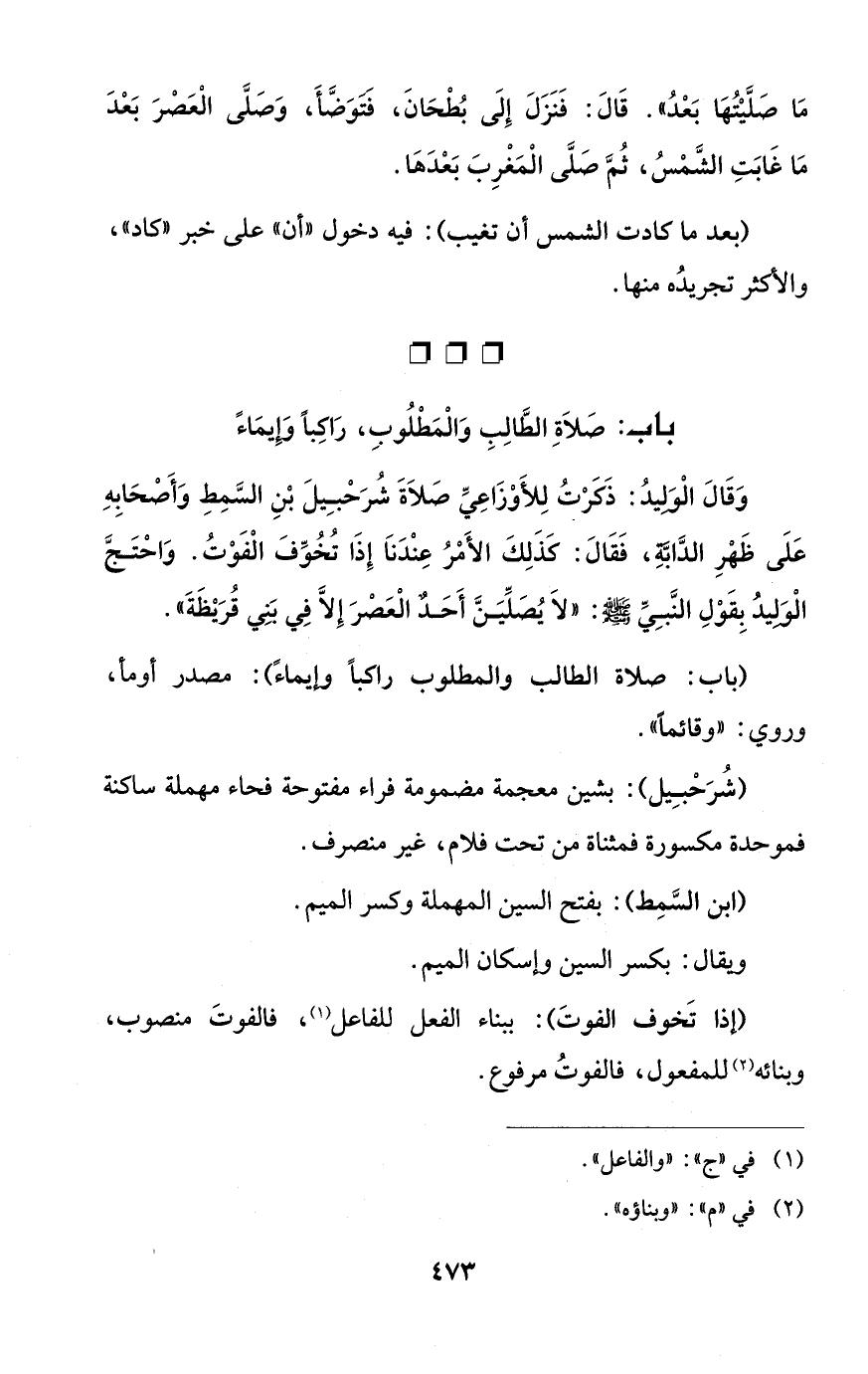 وَقَالَ الْوَلِيدُ: ذَكَرْتُ لِلأَوْزَاعِيِّ صَلاَةَ شُرَحْبِيلَ بْنِ السَّمِطِ وَأَصْحَابِهِ عَلَى ظَهْرِ الدَّابّةِ، فَقَالَ: كَذَلِكَ الأَمْرُ عِنْدَناَ إِذَا تُخُوِّفَ الْفَوْتُ. وَاحْتَجَّ الْوَلِيدُ بِقَوْلِ النَّبِيِّ - صلى الله عليه وسلم -: "لاَ يُصَلِّيَنَّ أَحَدٌ الْعَصْرَ إِلاَّ فِي بَنِي قُرَيْظَةَ".