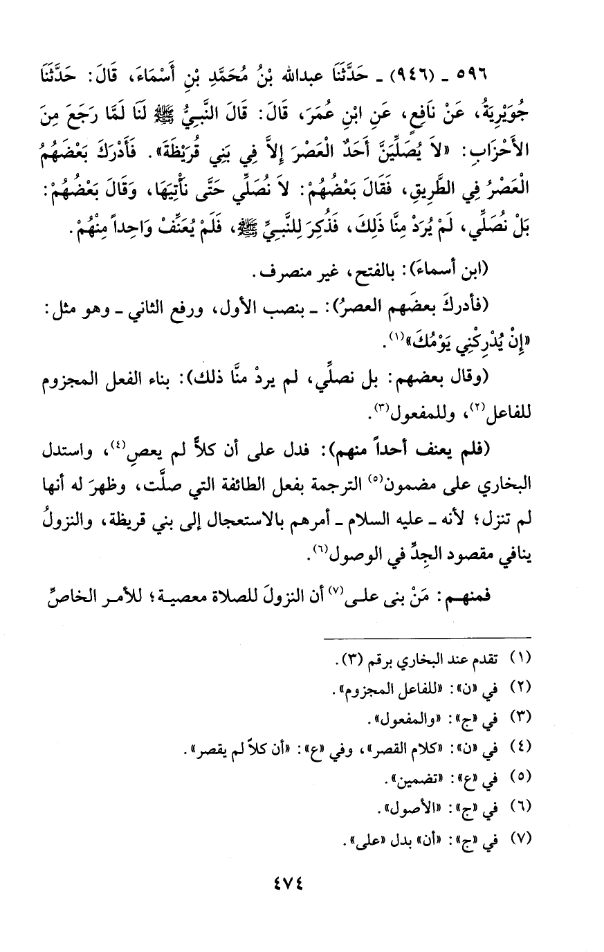 596 - (946) - حَدَّثَنَا عبد الله بْنُ مُحَمَّدِ بْنِ أَسْمَاءَ، قَالَ: حَدَّثَنَا جُوَيْرِيَةُ، عَنْ نَافِعٍ، عَنِ ابْنِ عُمَرَ، قَالَ: قَالَ النَبِيُّ - صلى الله عليه وسلم - لَنَا لَمَّا رَجَعَ مِنَ الأَحْزَابِ: "لاَ يُصَلِّيَنَّ أَحَدٌ الْعَصْرَ إِلاَّ فِي بَنِي قُرَيْظَةَ". فَأَدْرَكَ بَعْضَهُمُ الْعَصْرُ فِي الطَّرِيقِ، فَقَالَ بَعْضُهُمْ: لاَ نُصَلِّي حَتَّى نَأْتِيَهَا، وَقَالَ بَعْضُهُمْ: بَلْ نصُلِّي، لَمْ يُرَدْ مِنَّا ذَلِكَ، فَذُكرَ لِلنَّبِيِّ - صلى الله عليه وسلم -، فَلَمْ يُعَنِّفْ وَاحِداً مِنْهُمْ.