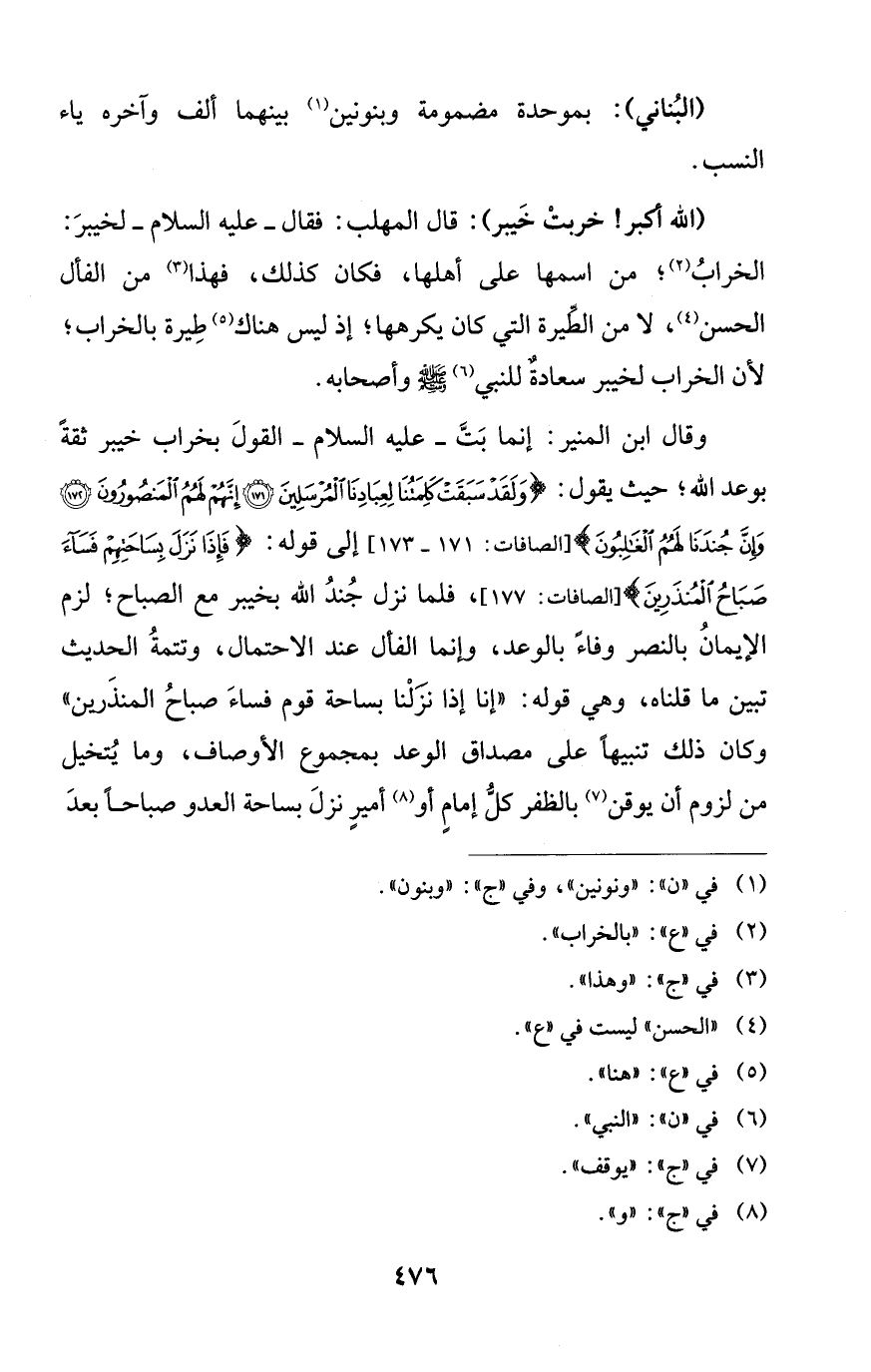 وقال ابن المنير: إنما بَتَّ - عليه السلام - القولَ بخراب خيبر ثقةً بوعد الله؛ حيث يقول: {وَلَقَدْ سَبَقَتْ كَلِمَتُنَا لِعِبَادِنَا الْمُرْسَلِينَ (171) إِنَّهُمْ لَهُمُ الْمَنْصُورُونَ (172) وَإِنَّ جُنْدَنَا لَهُمُ الْغَالِبُونَ} [الصافات: 171 - 173] إلى قوله: {فَإِذَا نَزَلَ بِسَاحَتِهِمْ فَسَاءَ صَبَاحُ الْمُنْذَرِينَ} [الصافات: 177]، فلما نزل جُندُ الله بخيبر مع الصباح؛ لزم الإيمانُ بالنصر وفاءً بالوعد، وإنما الفأل عند الاحتمال، وتتمةُ الحديث تبين ما قلناه، وهي قوله: "إنا إذا نَزَلْنا بساحة قوم فساءَ صباحُ المنذَرين" وكان ذلك تنبيهاً على مصداق الوعد بمجموع الأوصاف، وما يُتخيل من لزوم أن يوقن (¬7) بالظفر كلُّ إمامٍ أو (¬8) أميرٍ نزلَ بساحة العدو صباحاً بعدَ