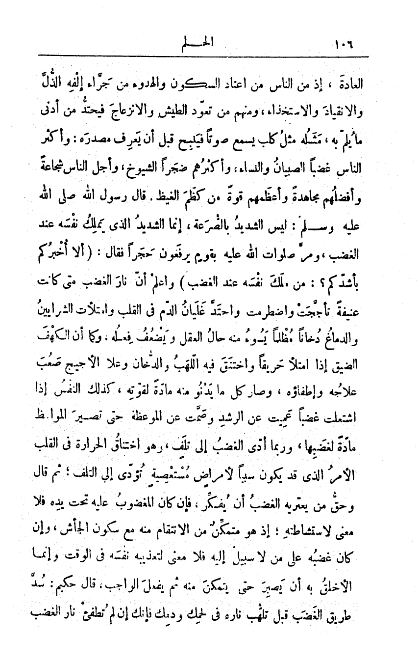 العادةَ، إذْ من الناسِ من اعْتاد السكونَ والهدوءَ من جَرّاء إلْفِه الذُّلَّ والانقيادَ والاستِخْذاء، ومنهم من تعوّد الطيشَ والانْزِعاجَ فيحتّدُّ من أدنى ما يُلمُّ به، مثلُه مثلُ كلب يَسْمعُ صَوْتاً فيَنْبِحُ قبلَ أن يَعْرفَ مَصْدَرَه: وأكثر الناس غضباً الصبيانُ والنّساء، وأكثرُهم ضَجراً الشيوخُ، وأجلُّ الناس شجاعةً وأفضلُهم مُجاهدةً وأعظمُهم قوةً منْ كظَمَ الغيظَ. قال رسول الله صلى الله عليه وسلم: (ليسَ الشَّديدُ بالصُّرَعة، إنَّما الشَّديدُ الذي يَمْلكُ نفسَه عِنْدَ الغضب) ومرَّ صلوات الله عليه بقومٍ يرفعون حَجراً فقال: (ألا أخبرُكم بأشدِّكم؟: مَنْ مَلكَ نَفْسَه عِنْدَ الغضب) واعْلمْ أنَّ نارَ الغضبِ متى كانتْ عنيفةً تأجَّجتْ واضْطرمَتْ واحْتدَّ غليانُ الدَّمِ في القلبِ وامْتلأتِ الشرايينُ والدماغُ دُخاناً مُظلِماً يَسوء منه حالُ العقلِ ويَضْعُفُ فِعْلُه، وكما أنَّ الكَهْفَ الضيِّقَ إذا امتلأ حَريقاً واختنقَ فيه اللهبُ والدخان وعَلا الأجيجُ صَعُبَ عِلاجُه وإطفاؤه، وصار كلُّ ما يدنو منه مادةً لقوّته، كذلك النفسُ إذا اشْتعَلَتْ غضباً عَمِيَتْ عن الرشدِ وصمَّت عن الموعظةِ حتى تصير المواعِظُ مادةً لغَضبِها، وربّما أدّى الغضبُ إلى تلفٍ، وهو اخْتناق الحرارةِ في القلب الأمْرُ الذي قد يكونُ سبباً لأمراضٍ مُسْتَعْصِيةٍ تؤدي إلى التلف؛ ثمَّ قال وحَقُّ مَنْ يعتريهِ الغضبُ أنْ يُفكِّر، فإنْ كان المغضوبُ عليه تحتَ يدِه فلا مَعنى لاسْتِشاطَتِه؛ إذْ هو مُتَمكِّنٌ مِنَ الانْتقامِ منهُ مع سكونِ الجأشِ، وإنْ كان غضبُه على مَنْ لا سبيلَ إليه فلا مَعْنى لتعذيبِه نفسَه في الوقت وإنَّما الأخلقُ بهِ أنْ