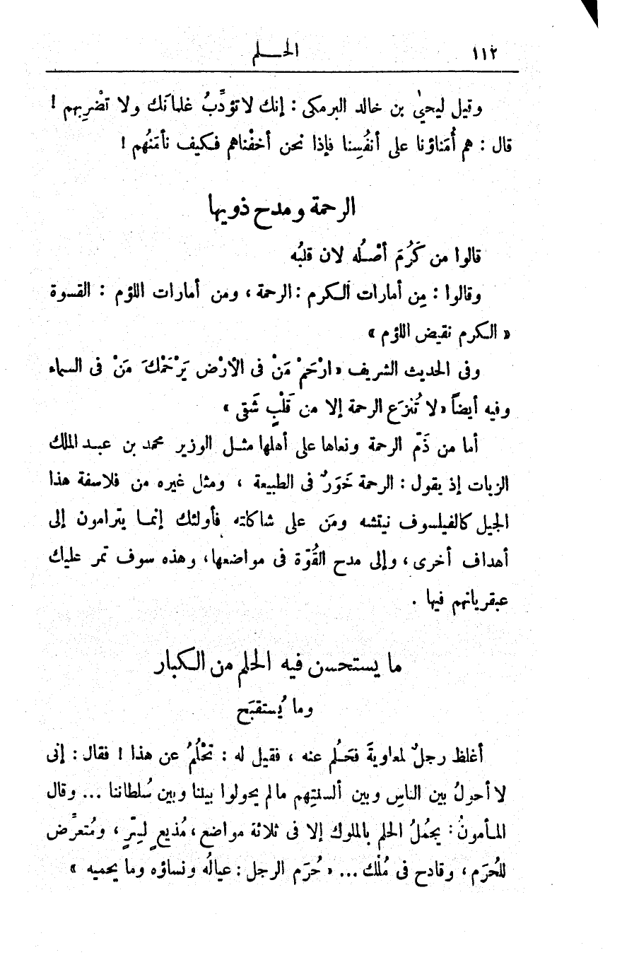أغْلَظَ رجلٌ لِمُعاويةَ فَحَلُمَ عنه، فقيل له: تَحْلُمُ عن هذا! فقال: إني لا أحولُ بينَ الناسِ وبينَ ألْسِنَتِهِمْ ما لَمْ يحولوا بينَنا وبينَ سُلْطانِنا. . . . وقال المأمونُ: يَجْمُلُ الحِلْمُ بالملوك إلا في ثلاثة مواضع، مُذيعٍ لسرٍّ، ومُتَعرِّضٍ للحُرَمِ، وقادحٍ في مُلْك. . . حُرَمُ الرَّجلِ: عيالُه ونساؤه وما يَحْميه